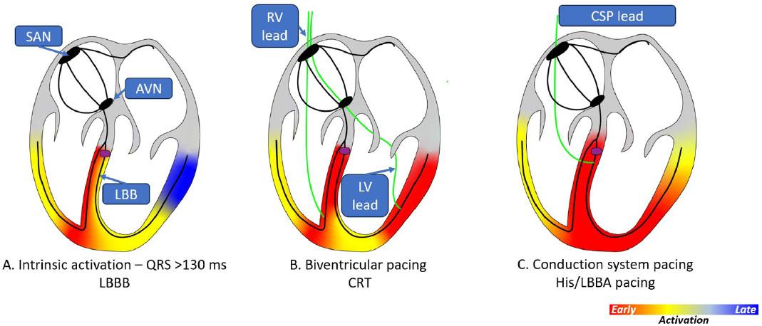 Cardiac electrical dyssynchrony types and functional consequences_ Wide QRS, QRS duration > 120 ms; LV, left ventricle; LBBB, left bundle branch block
