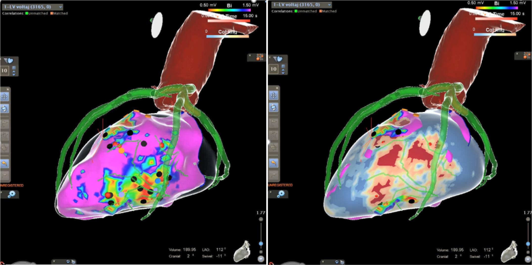 Voltage mapping is a method that visualizes electrogram signals on the electro-anatomical map and helps to determine the zones of healthy and scarred myocardium at specific sites. A large voltage indicates healthy tissue, while a low or absent voltage suggests diseased tissue or scars. Bipolar voltage mapping is employed for subendocardial evaluation, while unipolar mapping provides a more precise assessment of transmural and epicardial scar [2].