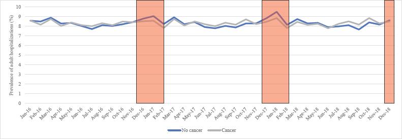 Arrhythmia by cancer and high influenza activity seasons (red box) across 2016-2018.