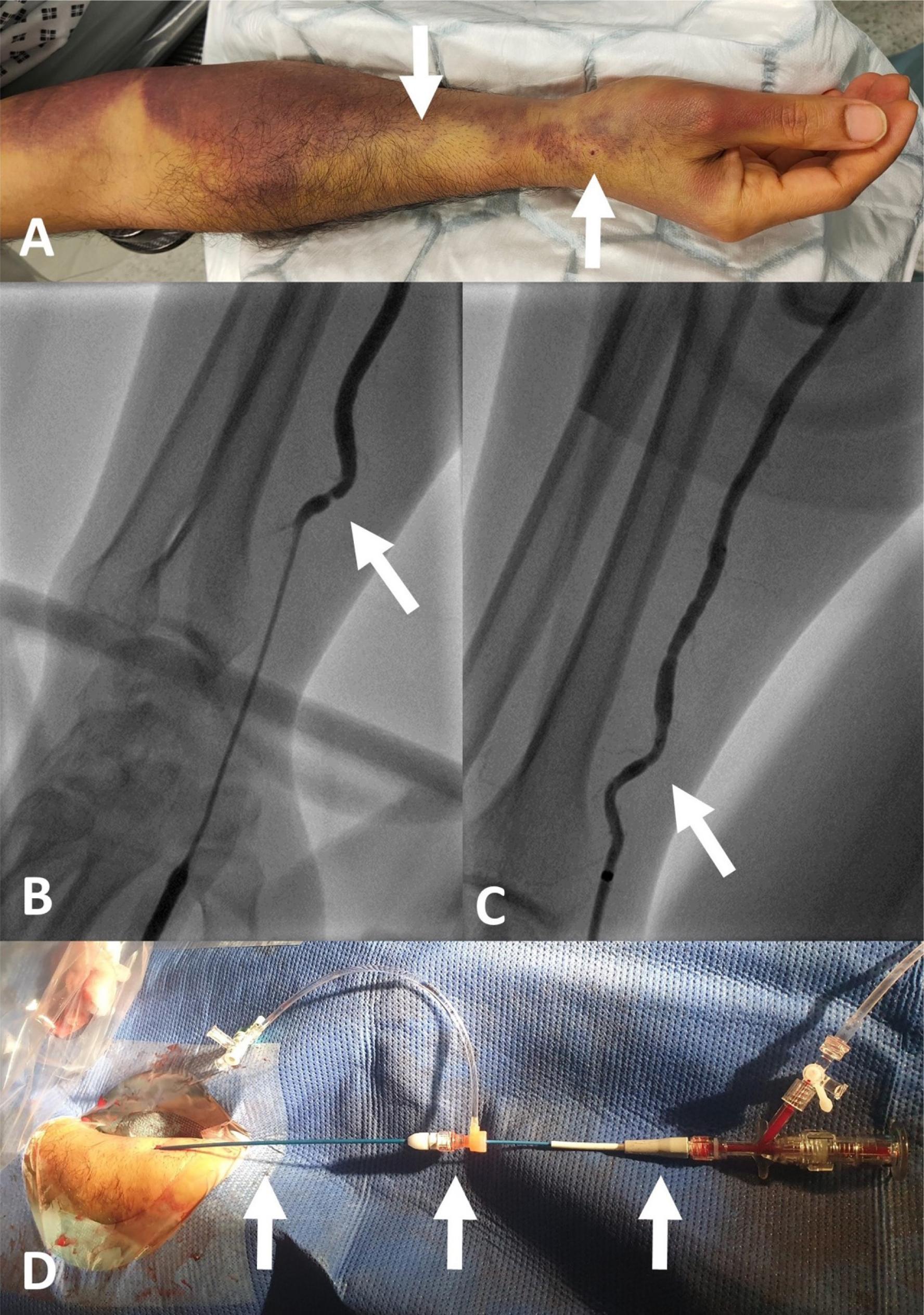 A – Forearm hematoma at day five with extensive bruising, right arrow indicates the prior dRA puncture site, and the left arrow points to likely site of perforation. B – Radial angiogram with arrow pointing to a napkin ring lesion corresponding to the tip of the prior 6Fr sheath. C – Repeat radial angiogram following staged coronary intervention showing no new disruption. D – The extra-long radial guiding sheath, left arrow points to the 90cm 5Fr hydrophilic coated guiding sheath (Cook Medical, Bloomington, IN, USA), middle arrow points to the short haemostatic valve (Terumo Corporation, Tokyo, Japan) and the right arrow points to the 5Fr EBU3.5 guiding catheter.