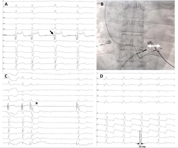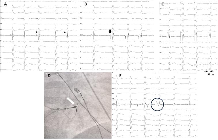 The post-procedural ECG showed a regular-paced rhythm with a narrow QRS complex of right bundle branch block morphology (Figure 2D).