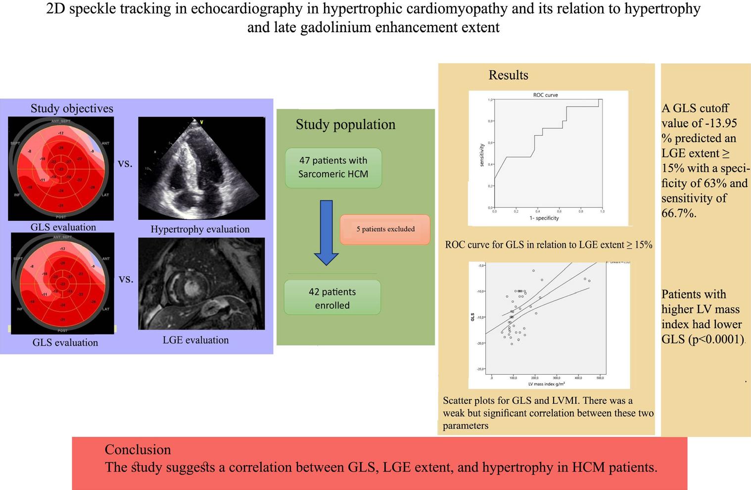 The present study has some limitations. First, the study population is relatively small and is from a tertiary care center (selection bias). A larger study must be performed to validate the role of GLS as a risk marker tool. Second, the longitudinal strain was measured only by 2D. In fact, because of the heterogeneity of the hypertrophy and the distribution of fibrosis in HCM, apical views may not have encompassed all hypertrophic and fibrotic regions. Third, circumferential and radial strains were not included in the analysis. The fourth limitation is related to the qualitative nature of the measurement technique for Late Gadolinium Enhancement (LGE). Specifically, instead of providing a precise quantification of LGE extent, the radiologist categorized patients into three groups based on LGE extent (≥15%, <15%, and 0). Finally, the cutoff of SLG has been obtained from a small sample size and applied to the same sample which is likely overemphasizing its accuracy.