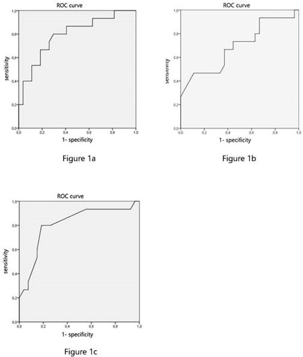 Receiver operating characteristic (ROC) curve in relation to LGE extent ≥ 15%.1a. Receiver operating characteristic (ROC) curve for LVMI in relation to LGE extent ≥ 15% Area Under the Curve (AUC) of 0.794 (95% CI 0.649 - 0.939) p=0.002. 1b. Receiver operating characteristic (ROC) curve for GLS in relation to LGE extent ≥ 15%. Area Under the Curve (AUC) of 0.691 (95% CI 0.515 - 0.868) p=0.042. 1c. Receiver operating characteristic (ROC) curve for MWT in relation to LGE extent ≥ 15%. Area Under the Curve (AUC) of 0.811 (95% CI 0.665 - 0.957) p=0.001.