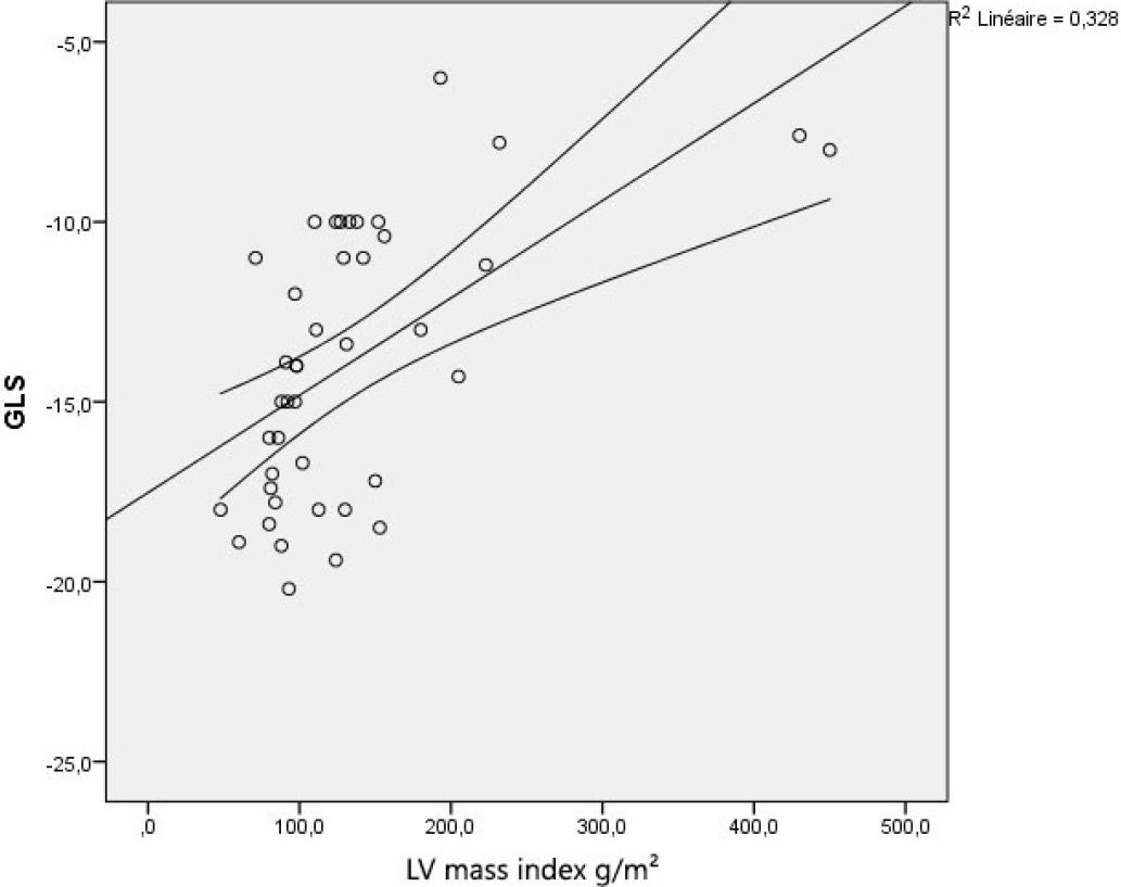 A correlation between the left ventricular mass index and the global longitudinal strain was investigated; the greater the left ventricular mass, the more reduced the strain.
