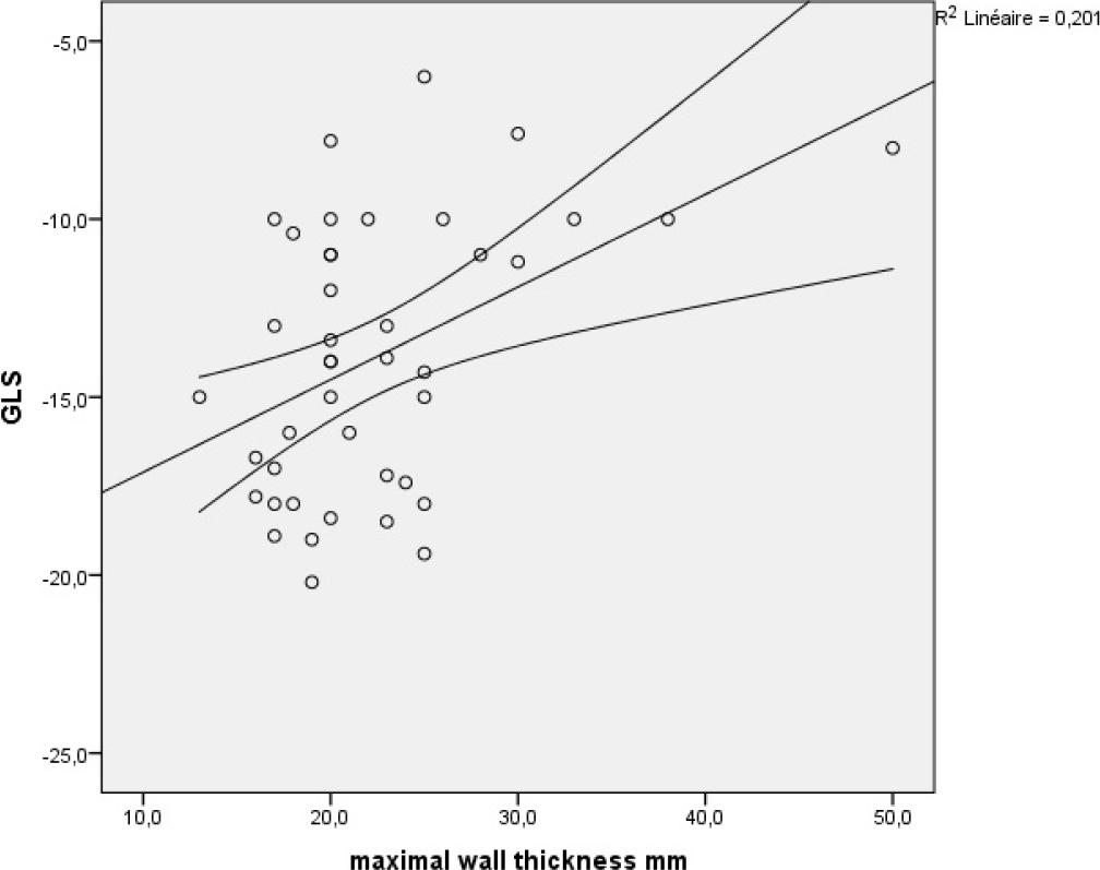 Scatter plot for Global Longitudinal Strain and maximal LV wall thickness. There was a weak but significant correlation between these two parameters. The linear line indicates the linear regression, and the two other indicates a 95% confidence interval for the mean.
