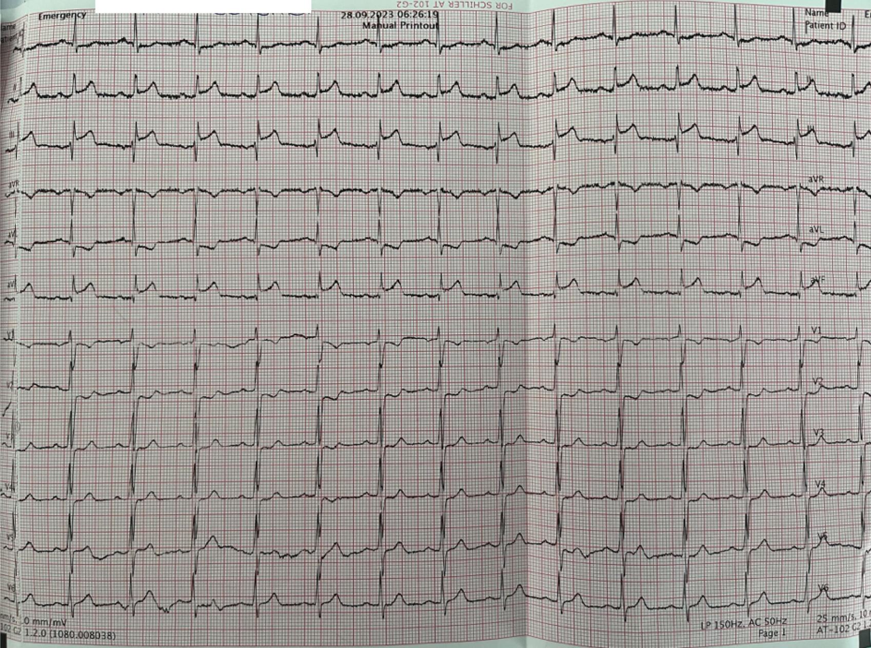 Presenting electrocardiogram: ST elevation in D2,D3, aVF and ST depression in V1-V2, D1,aVL.