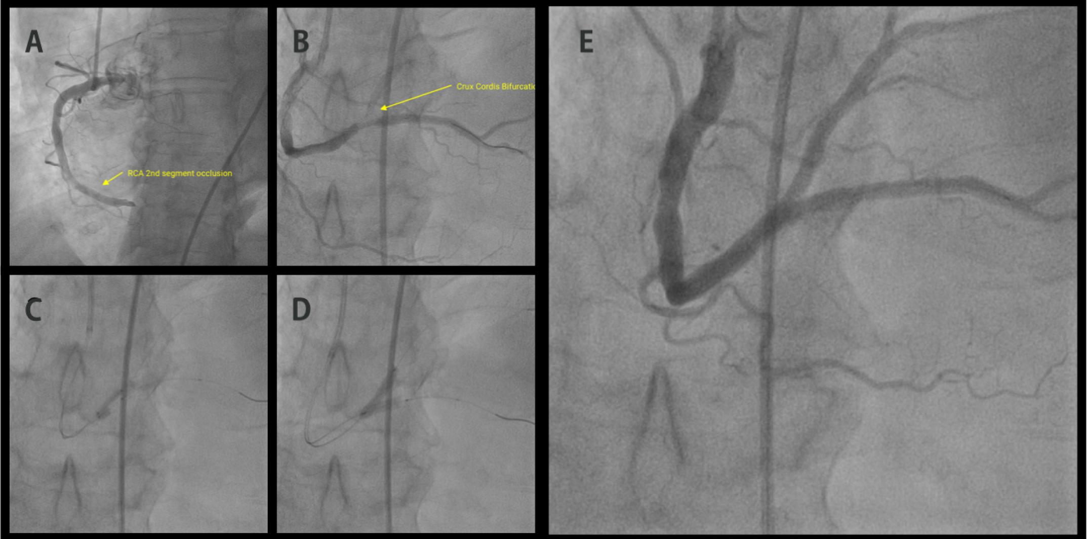A. Second segment of the right coronary artery occluded by thrombus. B. Bifurcation lesion of the crux cordis after workhorse guide wire crossing. C. Simultaneous kissing stents of the retroposterior branch and posterior descending artery. D. Balloon inflation of the 2 stents. E. Final result showing good peripheral perfusion..