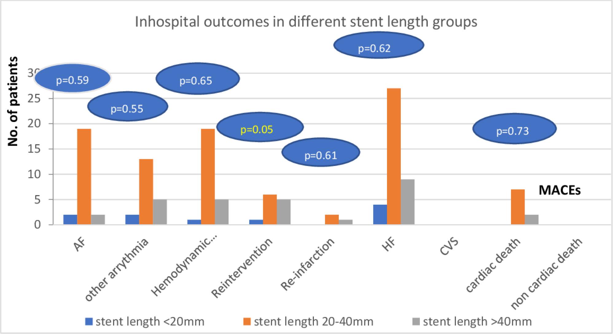 In hospital MACEs among the studied patients in different stent length groups, AF: atrial fibrillation, CVS: cerebrovascular stroke, HF: heart failure