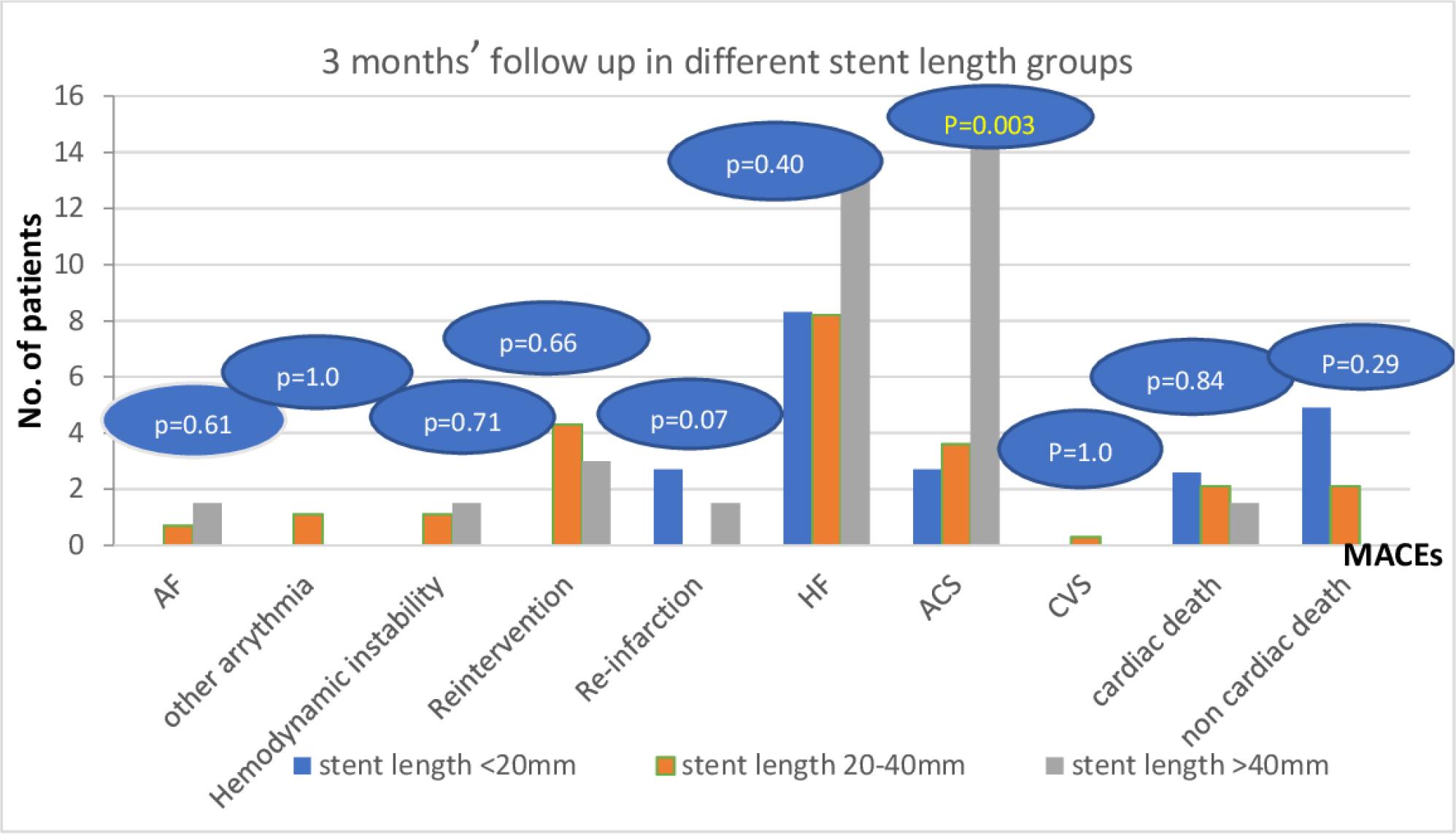 Three months’ follow up of MACEs among the studied patients in different stent length groups. ACS: acute coronary syndrome, AF: atrial fibrillation, CVS: cerebrovascular stroke, HF: heart failure.