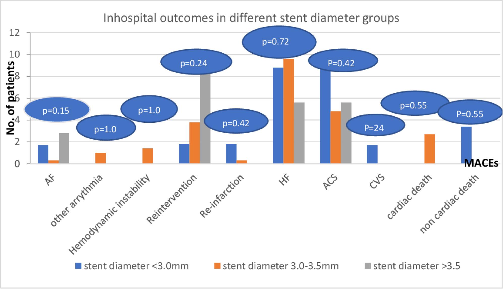 In hospital follow up of MACEs among the studied patients according to the stent diameter. AF: atrial fibrillation, CVS: cerebrovascular stroke, HF: heart failure.
