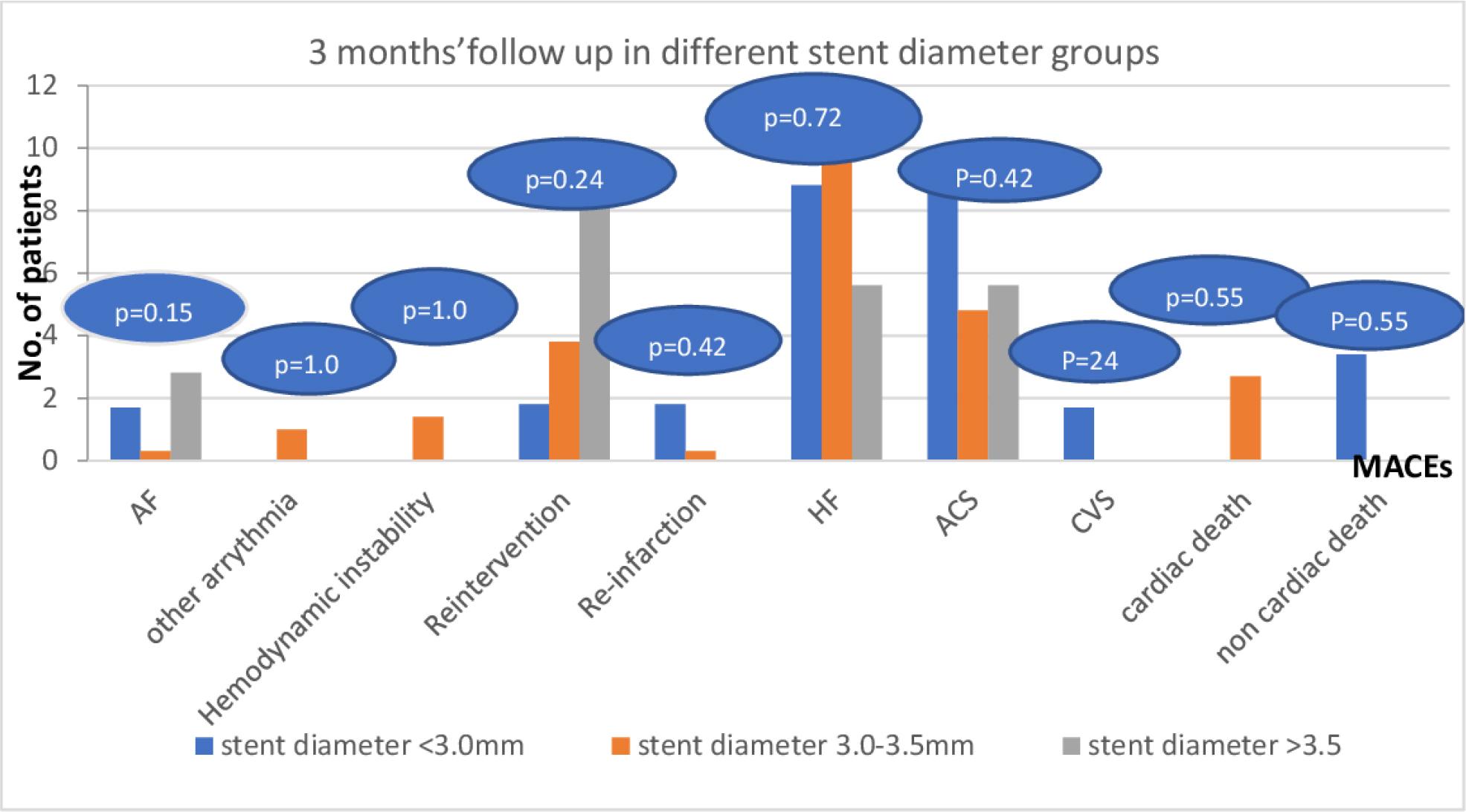 Three months’ follow up of MACEs among the studied patients in different stent diameter groups. ACS: acute coronary syndrome, AF: atrial fibrillation, CVS: cerebrovascular stroke. HF: heart failure.