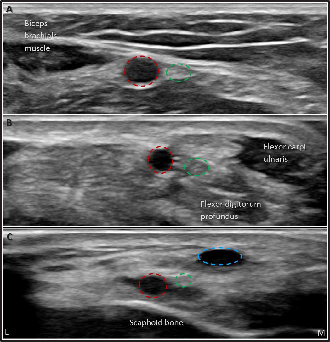 Angulated segment of the distal radial artery which should be avoided during puncture. Blue dotted circle, cephalic vein.