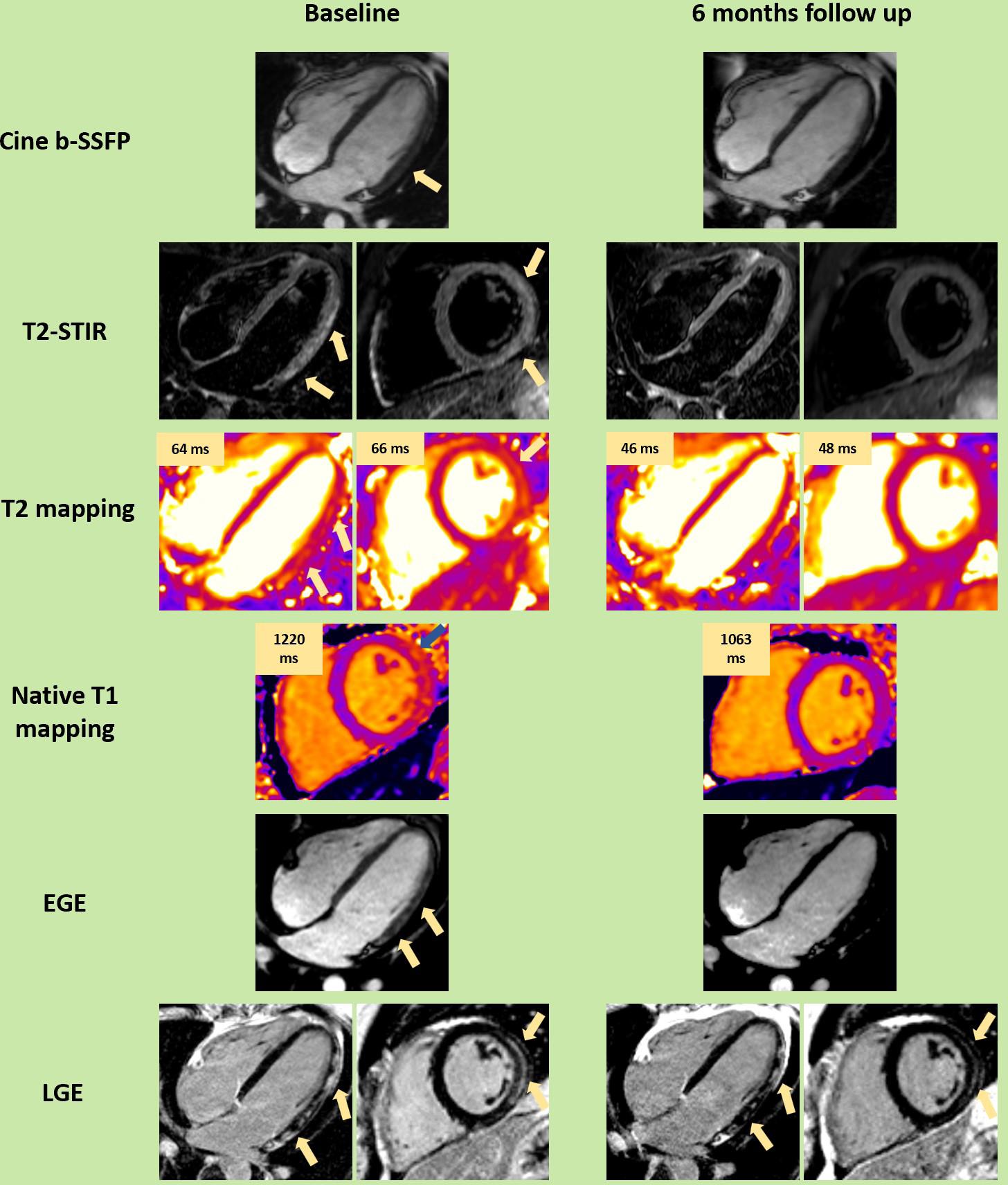 Contrast-enhanced cardiac magnetic resonance imaging of a patient with acute myocarditis at baseline and 6-month follow-up. High signal intensity in the basal and mid-to-apical lateral wall on cine and T2-STIR sequences (yellow arrows) corresponding to focally elevated myocardial T2 and native T1, indicating myocardial edema. The same myocardial segments also showed patchy, subepicardial high signal intensity on both EGE and LGE sequences (yellow arrows), revealing myocardial hyperemia, and myocyte necrosis and fibrosis, respectively. At the 6-month follow-up scan, a complete resolution of myocardial edema was observed on both T2-STIR and T2 mapping, though only a partial resolution of myocyte injury was seen on native T1 mapping and LGE (yellow arrows). All images were acquired using a 1.5 T scanner, with normal T1 ranging between 970 and 1050 ms and normal T2 between 40 and 51 ms. b-SSFP, balanced steady-state free precession, EGE (early gadolinium enhancement), LGE (late gadolinium enhancement), STIR (Short Tau Inversion Recovery).