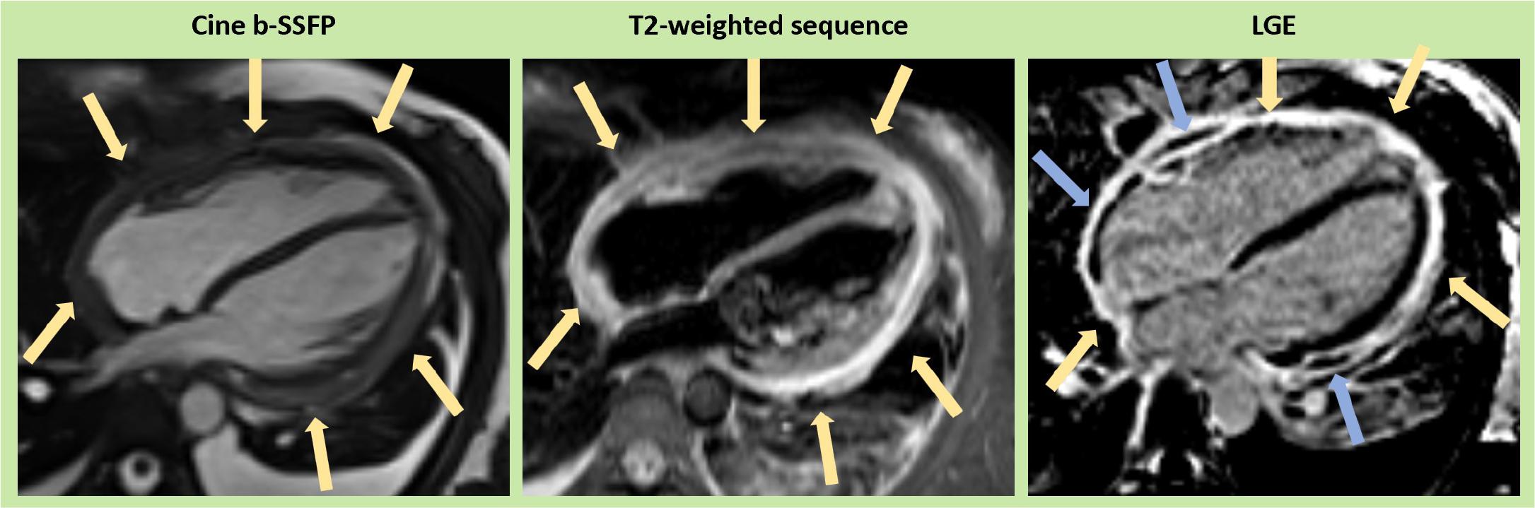 Contrast-enhanced cardiac magnetic resonance imaging of a patient with acute pericarditis showing significant thickening of the pericardial leaflets on Cine sequences (yellow arrows), high signal intensity on T2-weighted sequences (yellow arrows), and pericardial hyperenhancement on the LGE sequences (yellow arrows). This is associated with a trace pericardial effusion, which appears as low signal intensity between the two pericardial leaflets (blue arrows). b-SSFP (balanced steady-state free precession), LGE (late gadolinium enhancement).