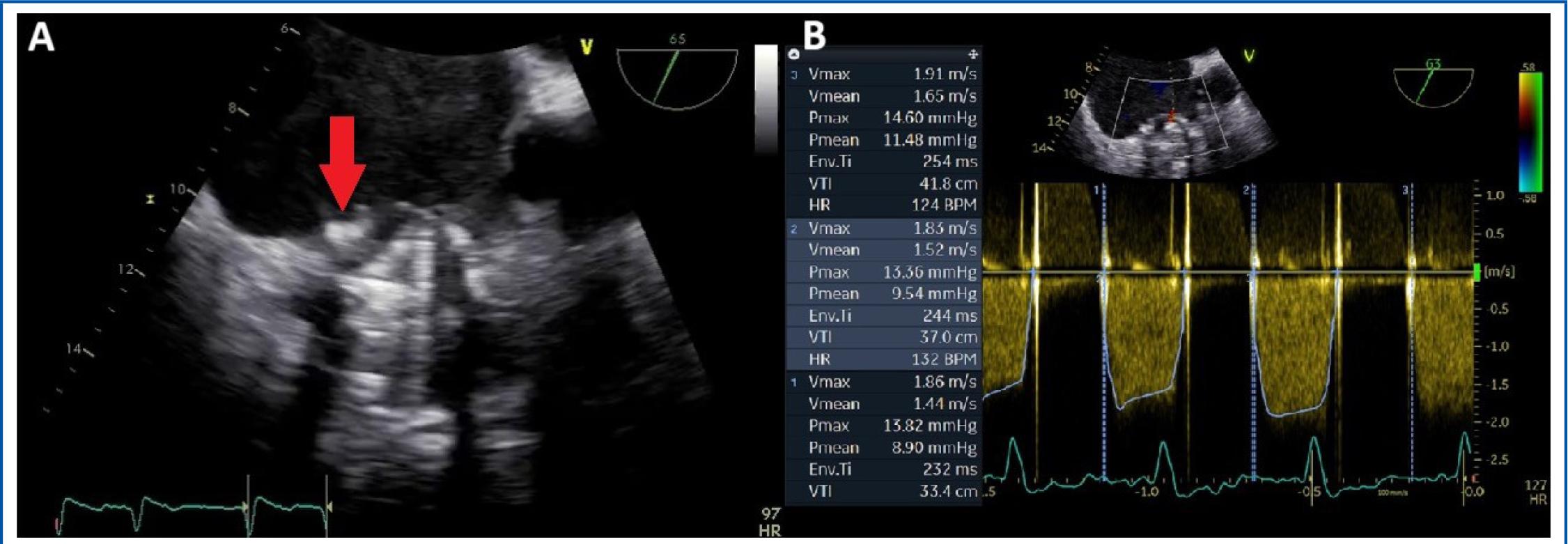 Transoesophageal echocardiography. A) 2D-image showing a stuck leaflet of the tricuspid prosthesis due to both pannus and thrombus (red arrow). B) CW Doppler flow interrogation of the tricuspid prosthesis revealing high mean transvalvular pressure gradient (examination in atrial fibrillation).