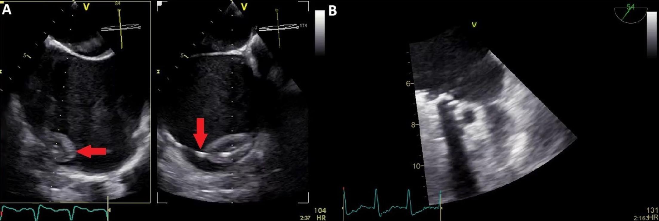Transoesophageal echocardiography. A) Pacing lead thrombosis (red arrow). B) Left atrial appendage thrombosis.