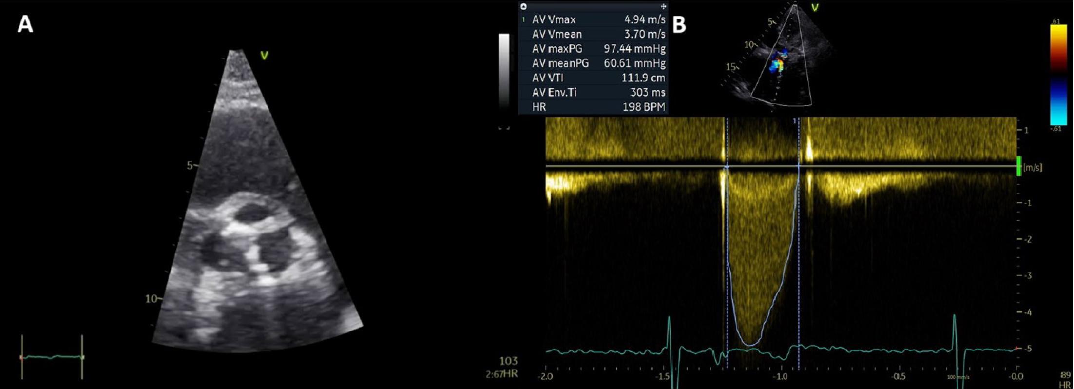 Transthoracic echocardiography. A) 2D parasternal short axis view of the aortic valve showing severe valvular calcifications. B) CW Doppler interrogation showing high velocity transvalvular aortic flow.