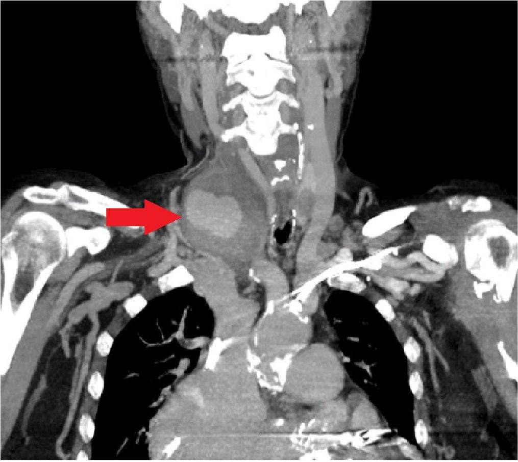 One month after TAVI, the patient presented to the emergency department with a right laterocervical pulsatile mass and newly developed hoarseness. An emergency computed tomography (CT) scan revealed a laterocervical hematoma extending into the mediastinum, with active bleeding causing a mass effect on adjacent structures (Figure 4). Surgical intervention was performed for bleeding control and drainage, while the anemic syndrome was corrected through blood transfusions with good outcome. The source of the bleeding was a pseudoaneurysm of a branch of the right subclavian artery, most likely developed due to central venous line manipulation during the prior hospitalization.
