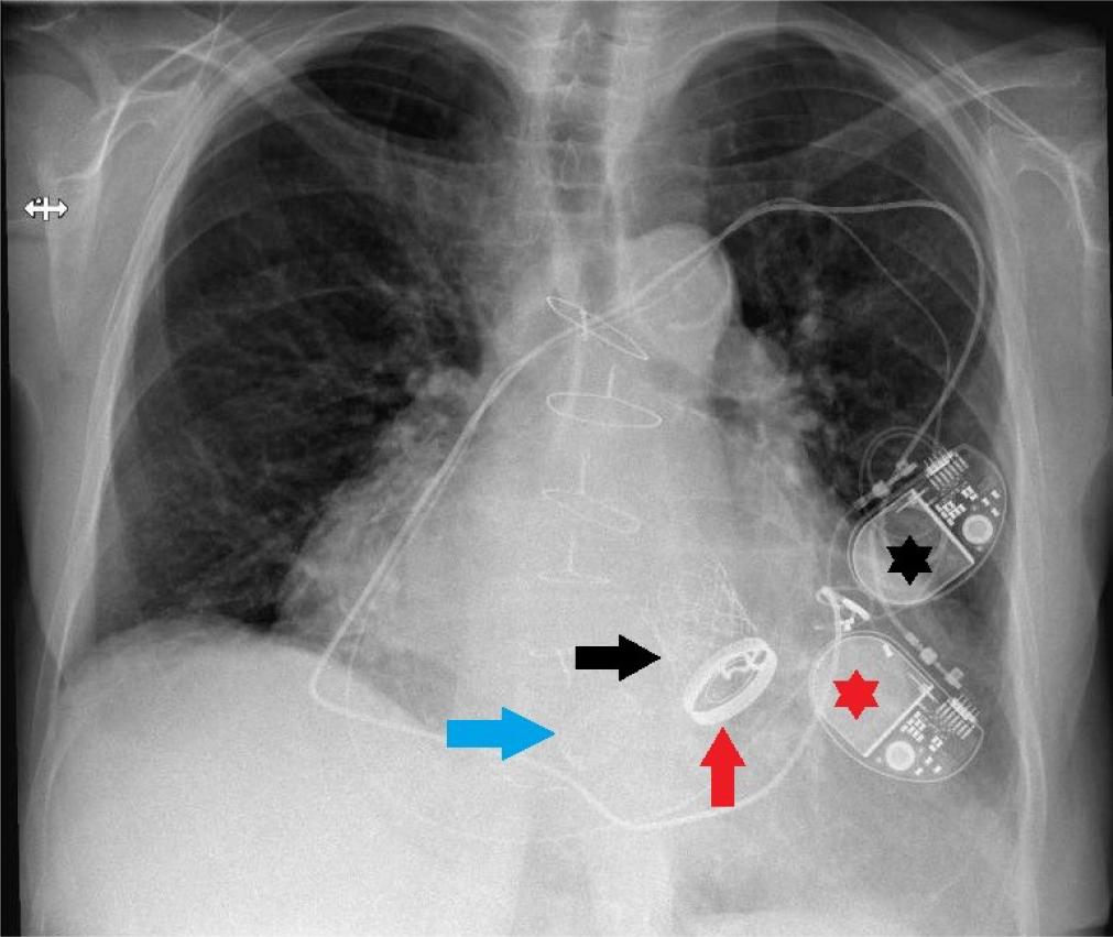 Chest X-Ray revealing the three different valve prosthese (blue arrow - tricuspid prosthesis, red arrow - mitral prosthesis, blac arrow - aortic prosthesis) and the two pacing systems (black asterisk first pacemaker, red asterisk - second pacemaker).
