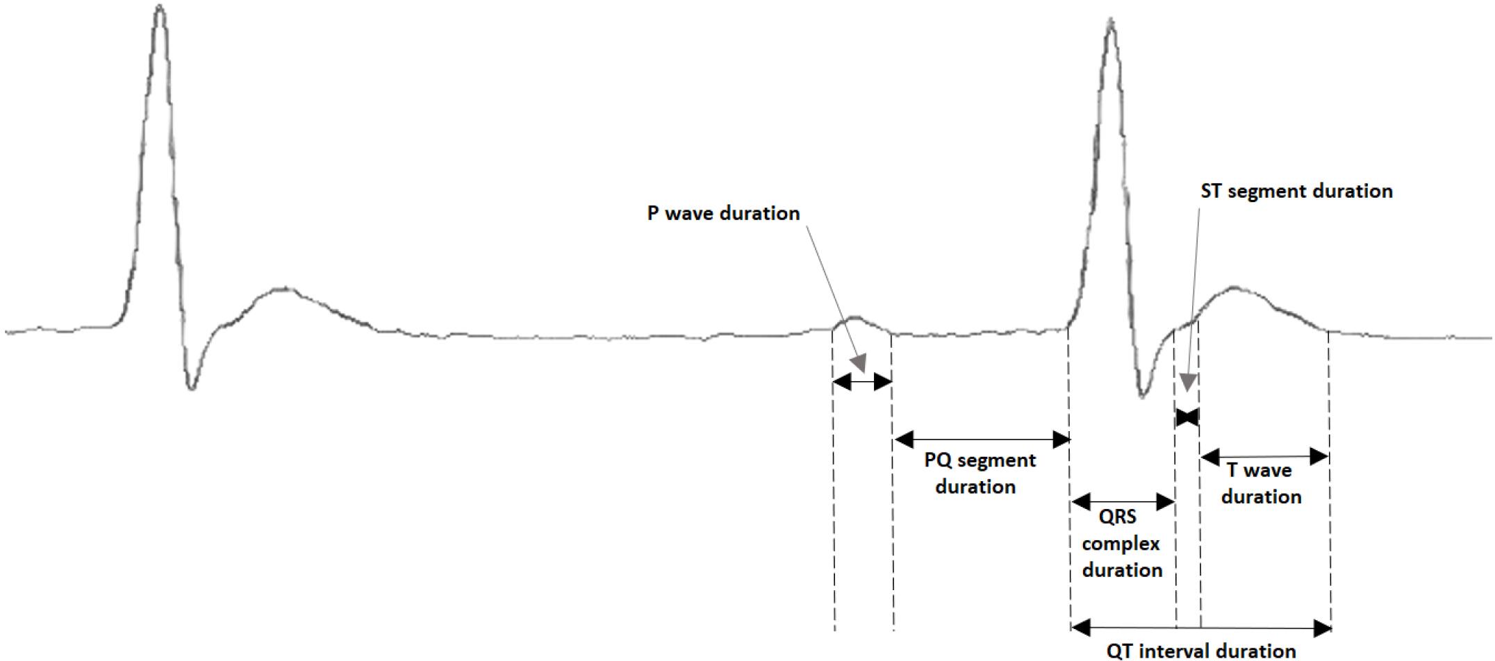 Following one-week of postoperative recovery, continuous 24-hour ECG recordings were performed on all animals. All recorded ECG traces were analyzed using a dedicated software developed with LabVIEW 2010 (National Instruments). For each animal, the mean heart rate/24 h (HR) and the durations of all ECG elements (i.e., the P wave, PQ segment, QRS complex, ST segment, T wave, and QT interval – Figure 1) were determined. The QT interval was measured from the beginning of the QRS complex to the end of the T wave, and the result was reported in ms. Based on previously published data in the literature, no correction formula for the QT interval in relation to HR was used21. Five consecutive cardiac cycles, obtained from ECG tracings recorded two hours after the start of the monitoring period, were evaluated for each animal. The study protocol is illustrated in Figure 2.