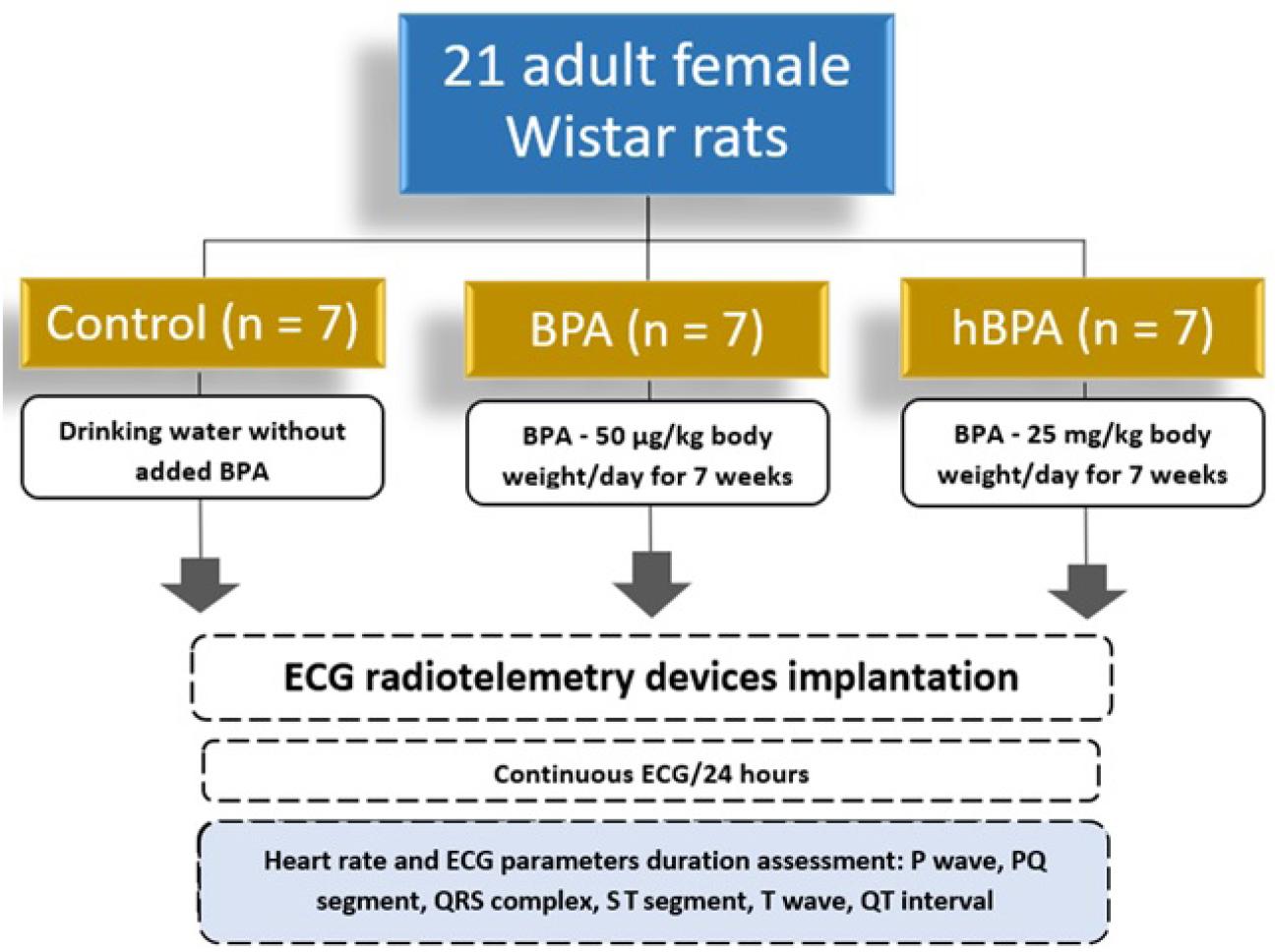 Accordingly, in the present study, we aimed to thoroughly evaluate the effects of chronic exposure to BPA at doses that are relevant to common human exposure, as well as at supraphysiological doses, on various ECG parameters in rats.