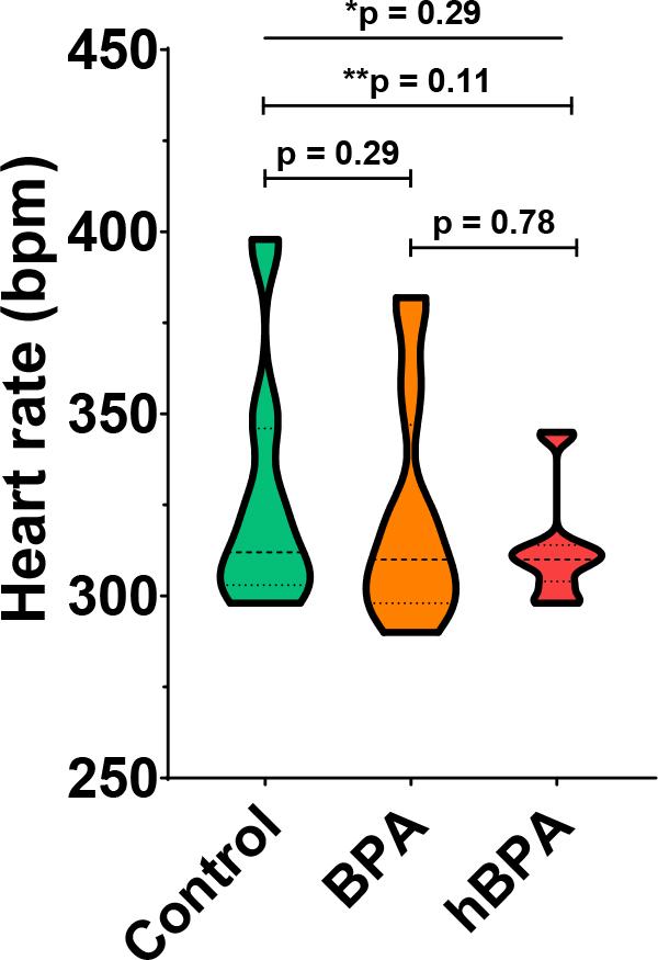 Heart rate in control rats and in rats exposed to human relevant (BPA) and supraphysiological (hBPA) bisphenol A doses for 7 consecutive weeks. Data are expressed as median and interquartile ranges; p-values were calculated using the Kruskal–Wallis and the Mann–Whitney U tests. * The p-value refers to the comparison between groups based on the Kruskal–Wallis test; ** the p-value refers to the comparison between the control and hBPA groups based on the Mann–Whitney test.