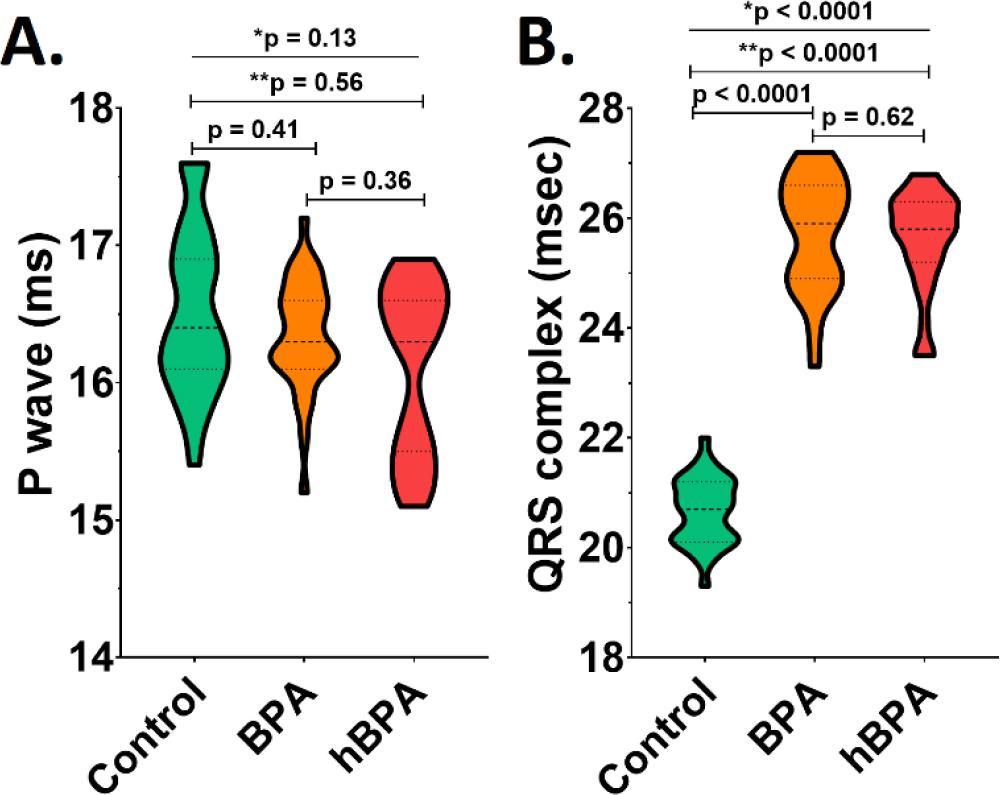 ECG parameters in control rats and in rats exposed to usual (BPA) and high (hBPA) bisphenol A doses for 7 weeks. The figure illustrates the duration of the P wave (A) and the QRS complex (B).Data are expressed as median and interquartile ranges; p-values were calculated using the Kruskal–Wallis and the Mann–Whitney U tests. * The p-value refers to the comparison between groups based on the Kruskal–Wallis test; ** the p-value refers to the comparison between the Control and hBPA groups based on the Mann–Whitney test.