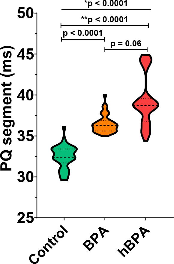 Regarding PQ segment duration, significant differences were observed among the three groups (p< 0.0001) – Figure 5. Animals in the BPA (36.30 ms; 35.60 - 36.90) and hBPA (36.70 ms; 36.80 - 39.60) groups exhibited significantly longer PQ segment durations compared to those in the Control group (32.40 ms; 31.70 - 33.40; both p< 0.0001). However, no statistically significant difference was identified between the BPA and hBPA groups (p= 0.06).