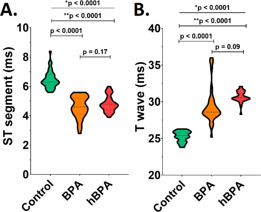 Significant differences were observed among the three groups in the ventricular repolarization phase, specifically in the duration of both the ST segment and the T wave (both p < 0.0001). The ST segment duration was significantly shorter in the BPA (4.60 ms; 4.10 - 5.20) and hBPA (4.80 ms; 4.40 - 5.20) groups compared to the Control group (6.30 ms; 6.10 - 6.80; both p < 0.0001), with no significant difference between the BPA and hBPA groups (p = 0.17) – Figure 6A. The animals in the Control (25.40 ms; 24.60 – 25.80; both p < 0.0001) group exhibited a significantly shorter T wave compared to the animals in the BPA (28.60 ms; 28.30 – 30.20) and hBPA (30.60 ms; 30.40 – 31.20) groups, with no significant difference between the BPA and hBPA groups (p = 0.09) – Figure 6B.