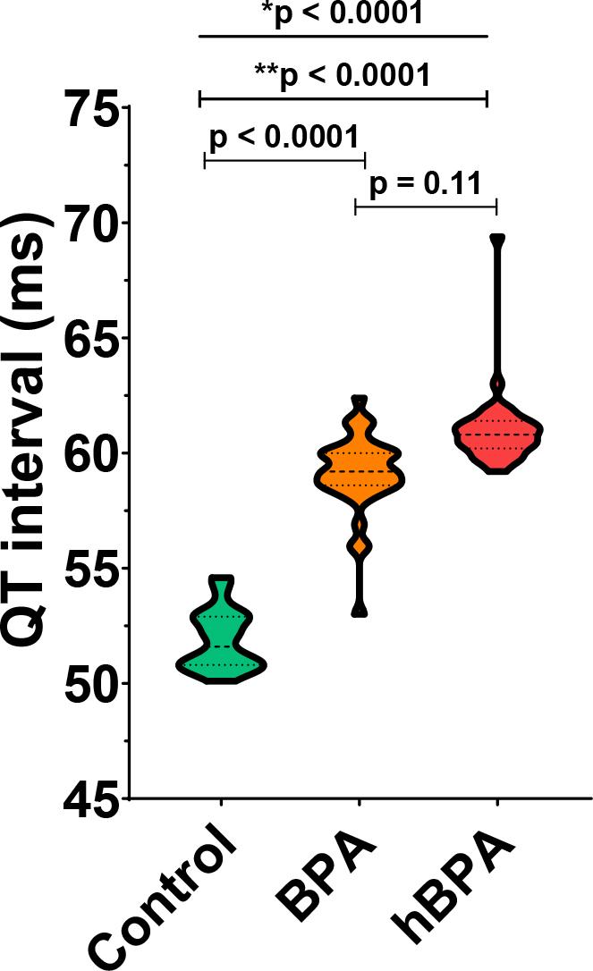 Significant differences were also observed among the three groups regarding the duration of ventricular electrical systole (p < 0.0001). The QT interval duration was significantly longer in the BPA (59.20 ms; 58.50 – 60.00) and hBPA (60.80 ms; 60.20 – 61.40) groups compared to the Control group (51.60 ms; 50.80 – 52.90; both p < 0.0001), with no significant differences between the BPA exposure doses (p = 0.11) – Figure 7.