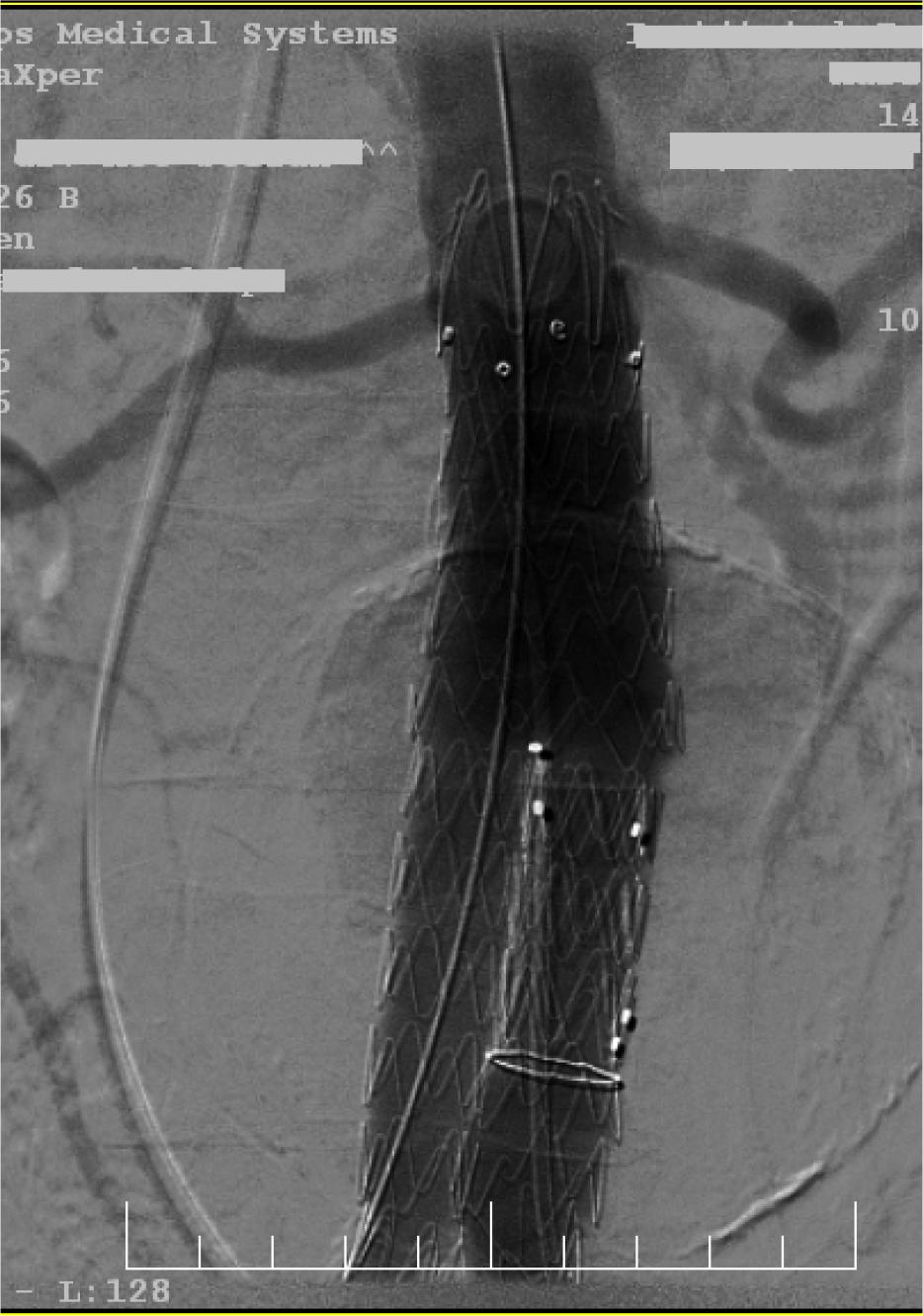 Fluoroscopy: deployment of the aortic endograft.