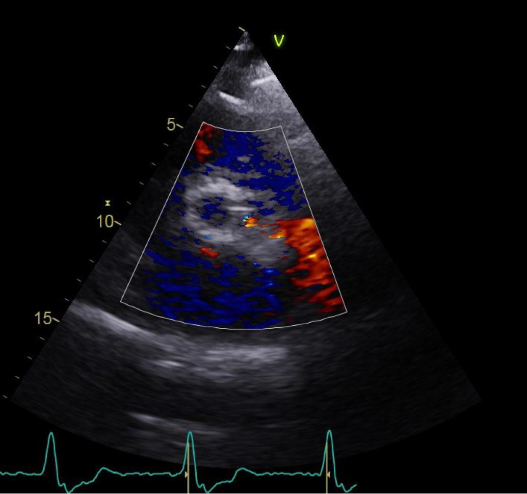 Transthoracic echocardiogram, parasternal short axis view of the paravalvular leak.