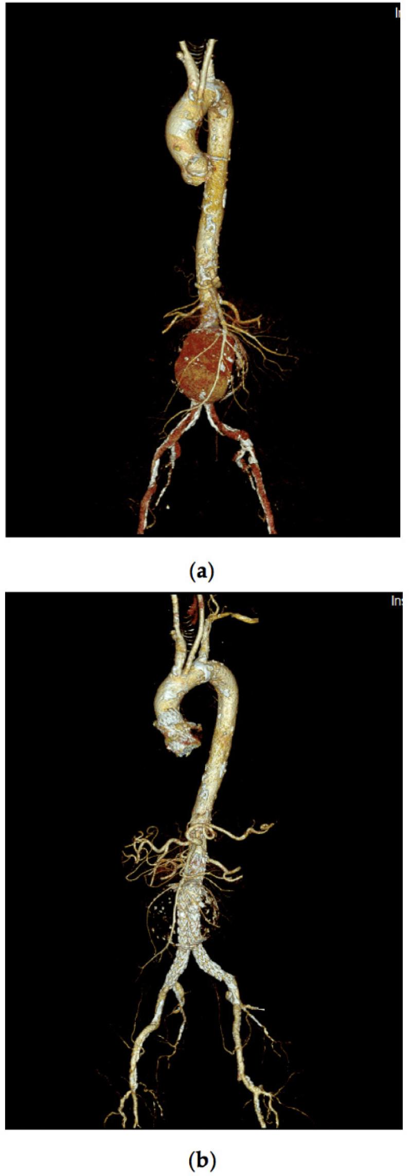 Computed Tomography Angiography - 3D reconstruction of the aorta (a) before, and (b) after aortic endo-graft implant.