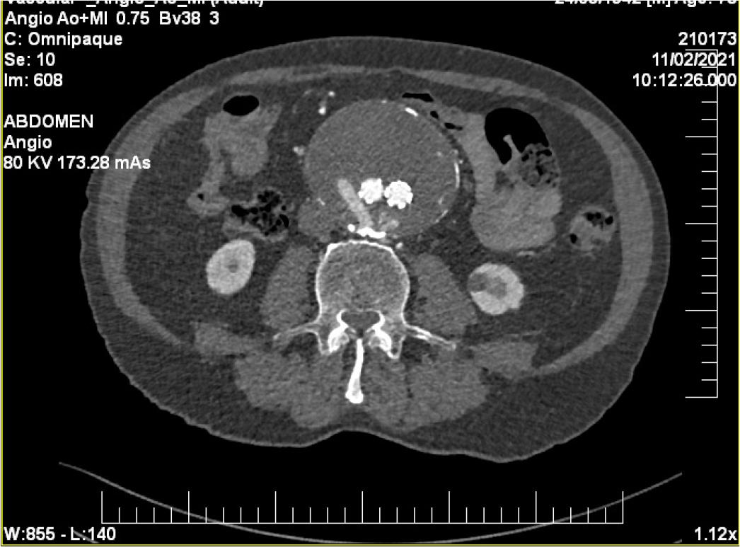 Considering the abdominal pulsatile mass, a Duplex vascular abdominal ultrasound was performed, followed by a computed tomography angiography (CTA), which showed a saccular infrarenal abdominal aneurysm (AAA) measuring 76 x 86 mm (AP x LL) with parietal thrombosis, extending towards the aortic bifurcation.