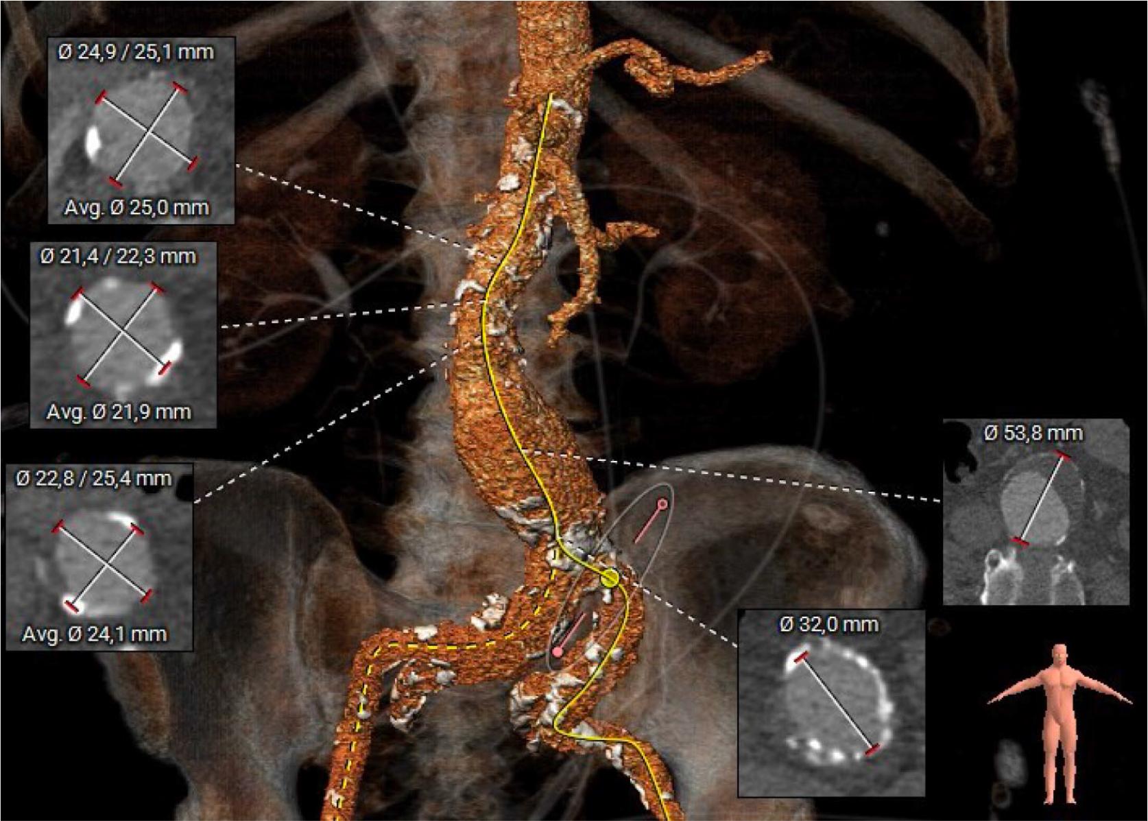 Given the patient’s high surgical risk, the Heart Team decided that TAVR was the most appropriate management strategy. As part of the pre-procedural workup, a computed tomography angiography (CTA) was performed, which revealed a 55/60 mm infrarenal AAA characterized by a long infrarenal neck with mural thrombus and limited calcification. Additionally, the CTA identified a 4 cm aneurysm involving the right common iliac artery (RCIA), with parietal thrombosis, significant calcifications, and a residual lumen measuring 18 mm (Figure 6).