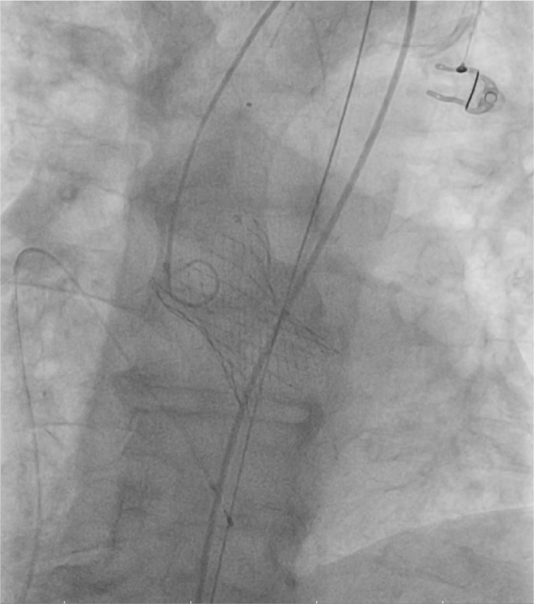 Fluoroscopic image: deployment of the pre-dilated Medtronic valve.