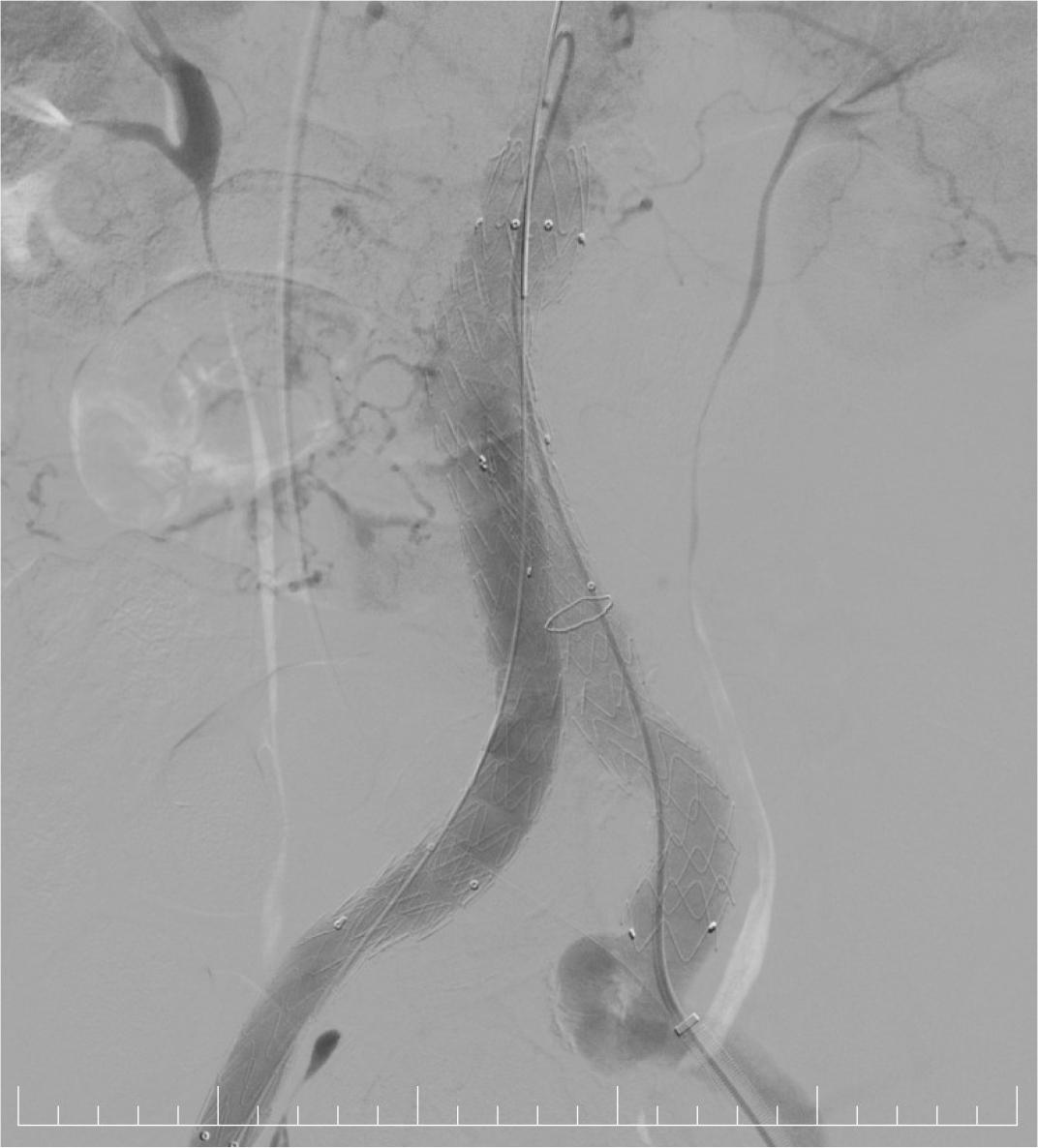 The graft was properly positioned and expanded with complete aneurysm exclusion and no visible leak. The right distal radial artery (5F sheath) was left in place for invasive blood pressure monitoring. Because the proper hemostasis was impossible to achieve at the femoral vascular access site, surgical hemostasis was necessary.