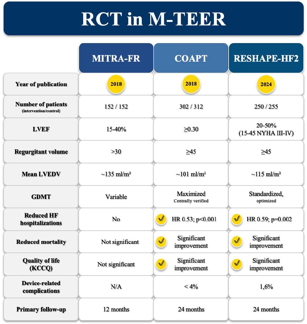 Beyond baseline characteristics, notable differences in therapeutic management may have contributed to the divergent findings. In COAPT, patient selection was more rigorous: individuals had to be on maximally tolerated doses of GDMT, and, when appropriate, CRT, ICD therapy, or coronary revascularization had to be optimized prior to randomization.[69,70] In contrast, the MITRA-FR protocol allowed for ongoing adjustments of medical therapy during follow-up, with some patients not being fully optimized at baseline (Figure 1).[68,70] This variability could have diluted the potential benefits of MitraClip. Moreover, a more aggressive interventional approach was pursued in COAPT, as evidenced by a greater number of clips implanted per patient and a more consistent, sustained reduction in MR severity during follow-up.[69] This difference in procedural intensity may have further limited the ability of MITRA-FR to detect a treatment benefit.