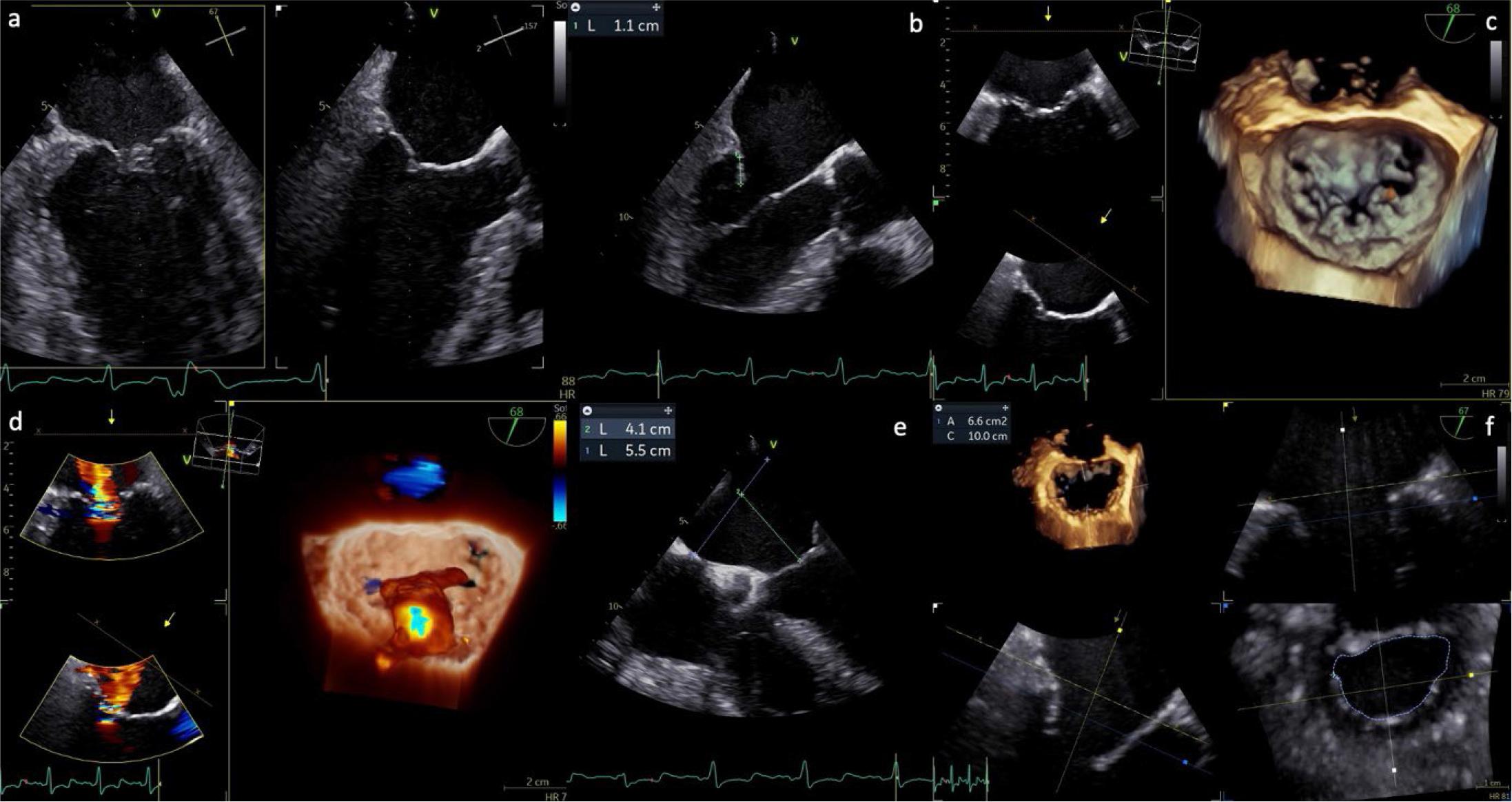 Preprocedural TOE assessment in a case of SMR. (a) X-plane bicommissural and LV long-axis view (67°/157°); (b) measurement of the posterior leaflet, showing adequate length for device grasping; (c) 3D reconstruction of the mitral valve, en face (surgical) view; (d) 3D reconstruction demonstrating severe SMR due to leaflet restriction, with a centrally originating jet directed posteriorly; (e) evaluation of septal puncture feasibility; (f) multiplanar reconstruction (MPR) for calculation of the anatomical MVA.