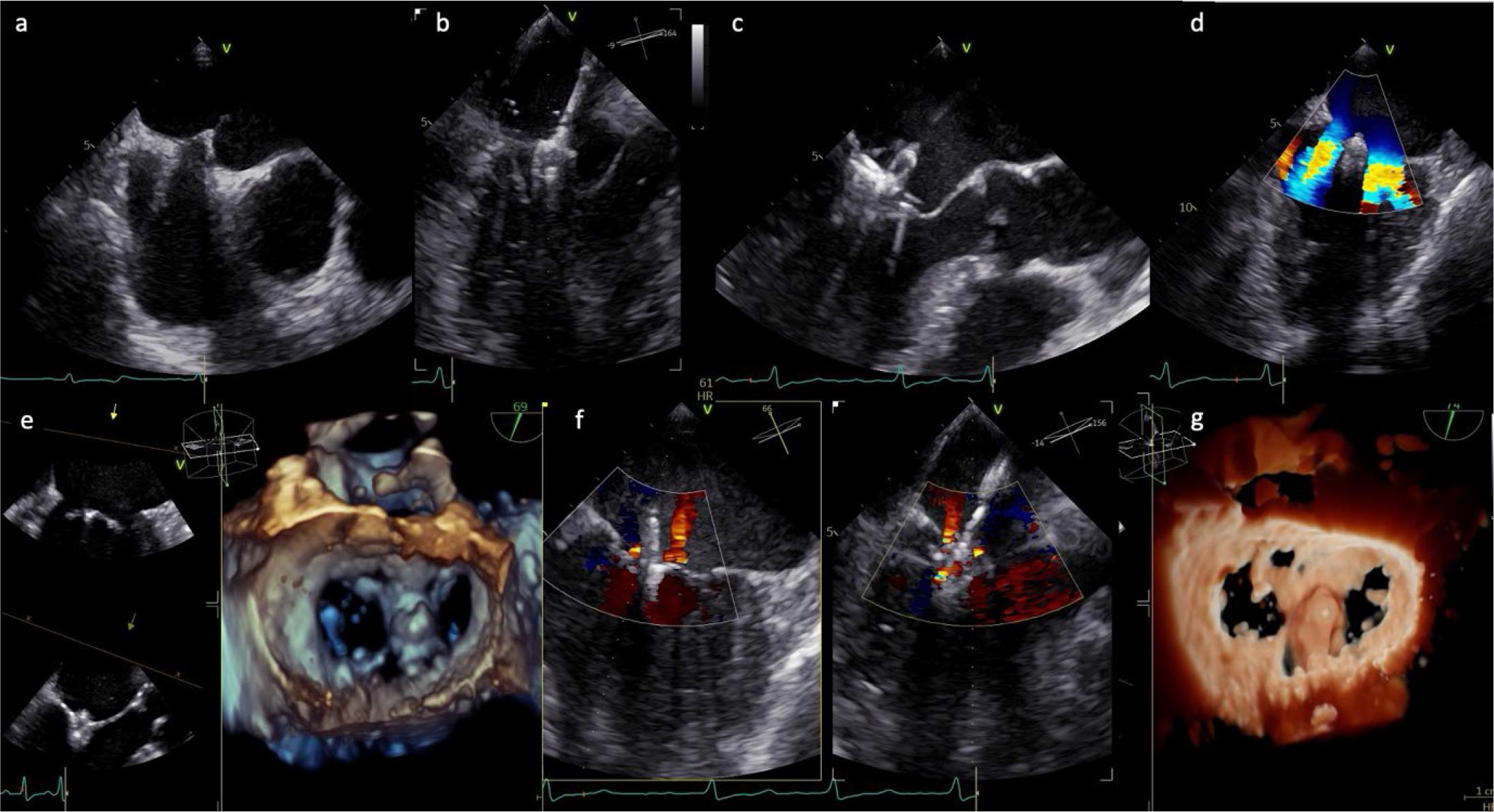 Intraprocedural TOE guidance during TEER for SMR. (a) Transseptal puncture in the aortic valve short-axis view (45°); (b) advancement and steering of the catheter towards the mitral plane; (c) catheter orientation perpendicular to the mitral plane, followed by valve crossing and leaflet grasping; (d), (f) device positioned above the mitral annulus, perpendicular to the leaflet coaptation line, typically at the origin of the regurgitant jet, which is reduced after device deployment; (e), (g) 3D reconstruction of the mitral valve, en face (surgical) view, after device deployment.