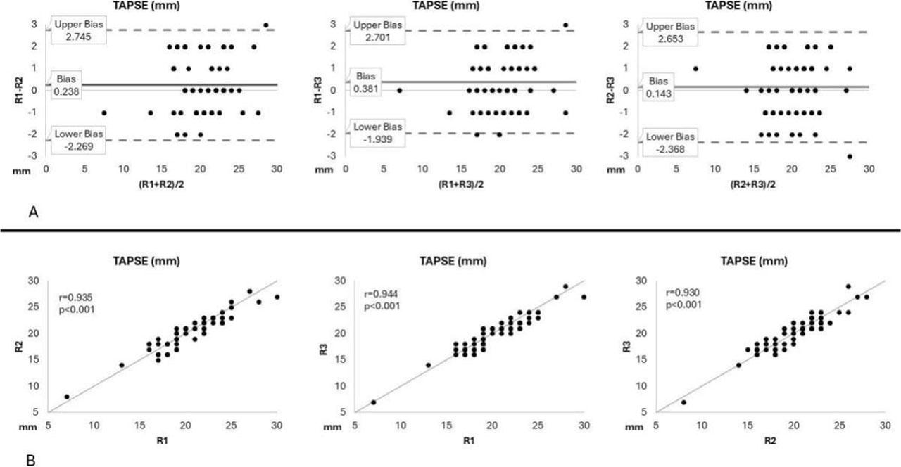 Bland-Altman plots (panel A) and correlations (panel B) for measurements of tricuspid annular plane systolic excursion (TAPSE) by advanced (R1), intermediate (R2), and beginner (R3) readers.
