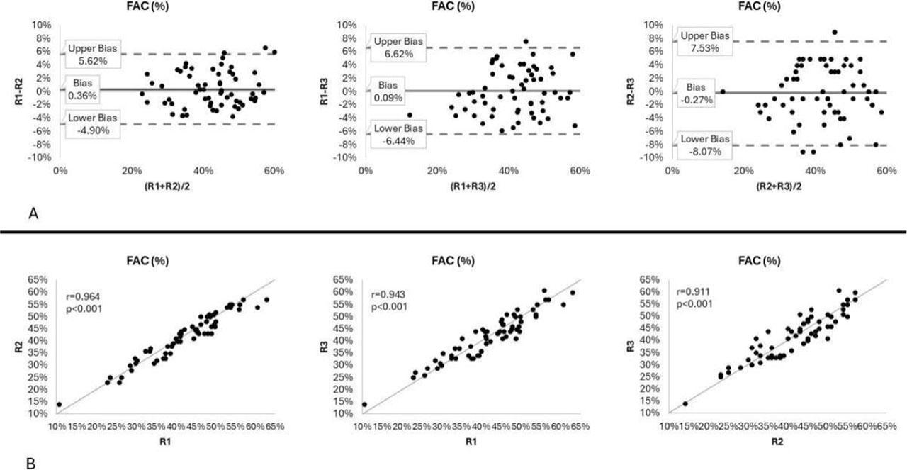 Bland-Altman plots (panel A) and correlations (panel B) for measurements of fractional area change (FAC) by advanced (R1), intermediate (R2), and beginner (R3) readers.