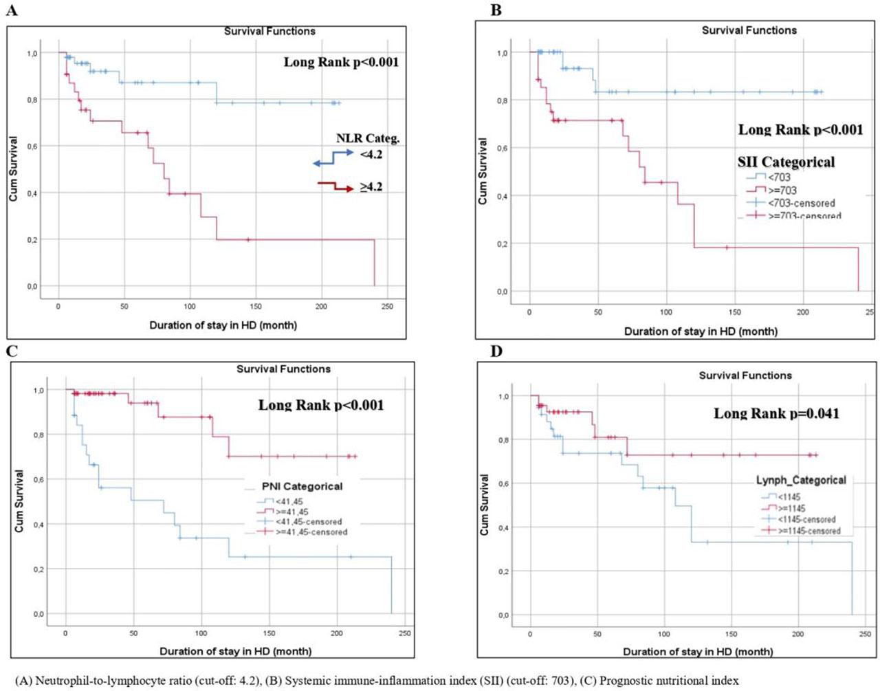 Hemodialysis patients have numerous non-traditional cardiovascular risk factors, including left ventricular hypertrophy, coronary artery disease, rapid electrolyte shifts, QT dispersion, and hyperphosphatemia [10]. In previous studies, hyperphosphatemia, persistent inflammation, and malnutrition have been shown to worsen prognosis [11,12,13]. Hematological indices such as the Neutrophil-to-Lymphocyte Ratio (NLR), the Systemic Immune-Inflammation Index (SII), and the Prognostic Nutritional Index (PNI) have been investigated as prognostic markers in chronic kidney disease and hemodialysis cohorts [12,13,14].