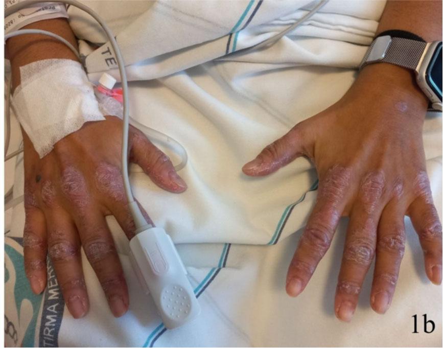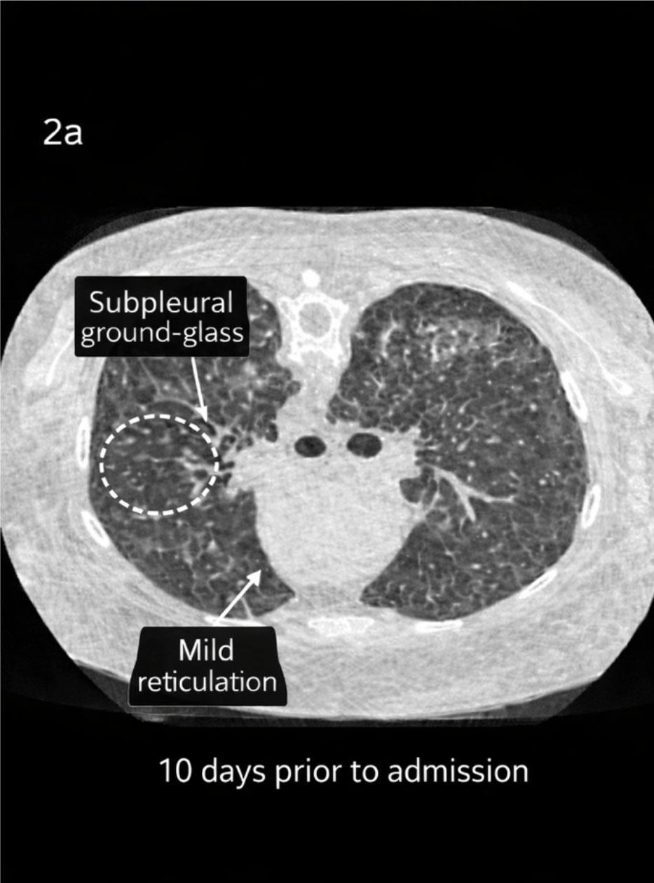 | Day 4–5 | Hemodynamic instability and multiorgan dysfunction | Hypotension, tachycardia, acute kidney injury (eGFR < 15 mL/min) | Maximal supportive care and immunomodulatory therapy | Death due to refractory respiratory failure secondary to anti-MDA5–associated RP-ILD |