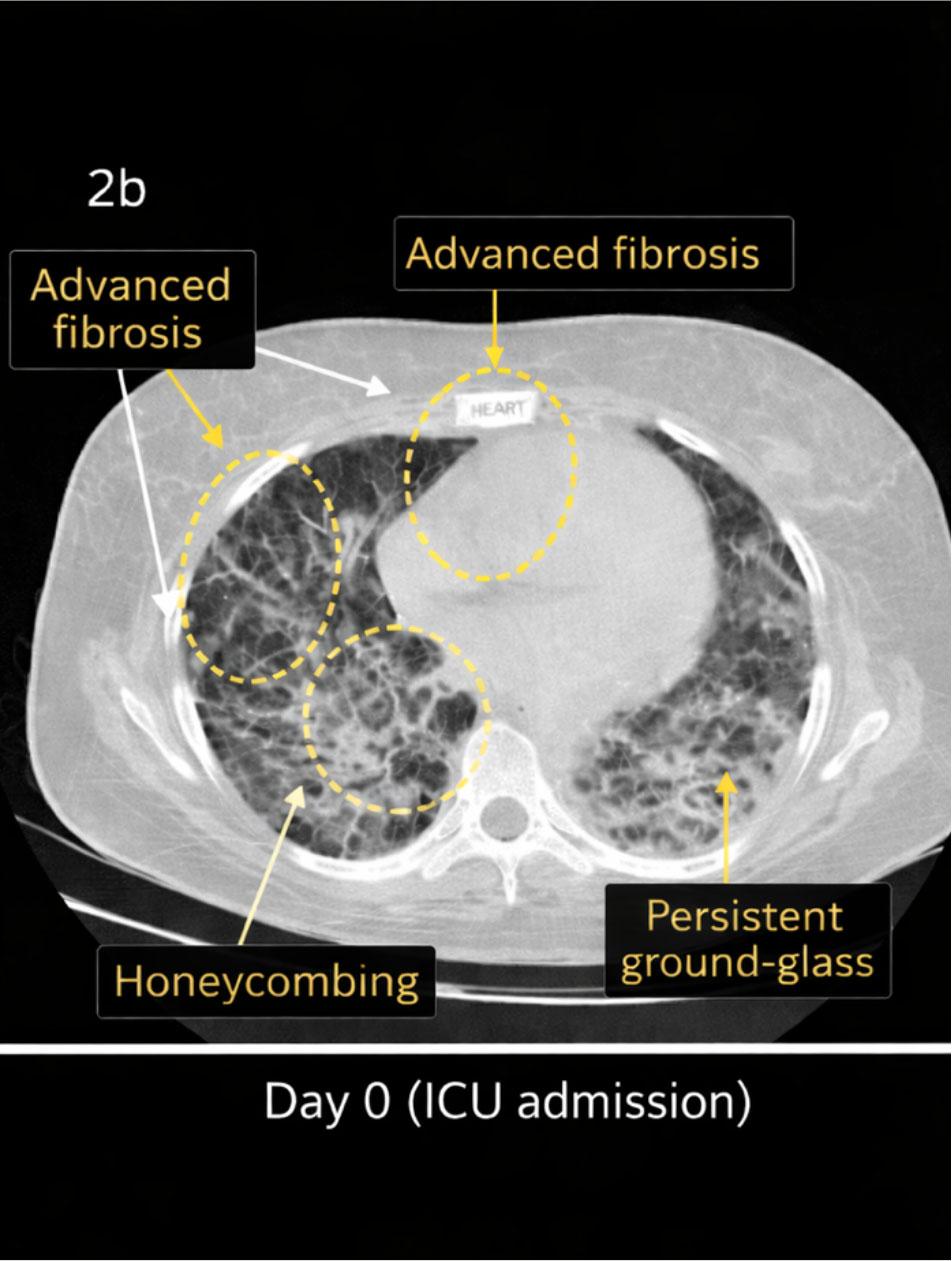 | Day 0 (ICU admission) | Progressive dyspnea, fever, hypoxemia (SpO2 75% RA) | Labs: CRP 32 mg/L, ESR 24 mm/h, severe lymphopenia (0.4×103/µL); Chest CT: rapidly progressive bilateral fibrotic ILD | Oxygen therapy; empirical levofloxacin + ceftriaxone; MMF discontinued; IVIG (0.4 g/kg/day) initiated | Respiratory distress persisted |