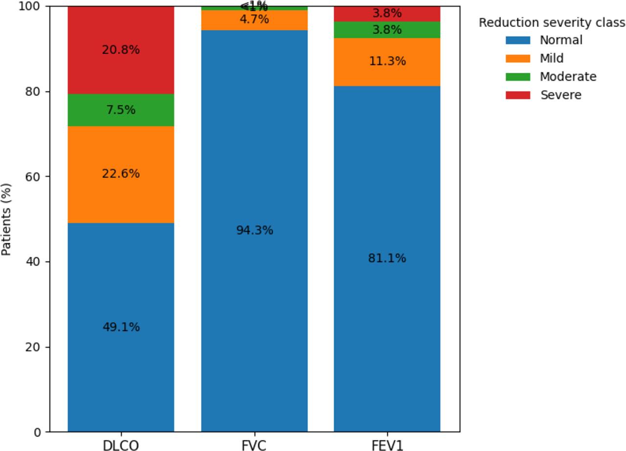 Pulmonary status at the time of PFT was characterized by a low prevalence of respiratory symptoms (Table 2): 7.5% of patients reported dyspnea, 0.9% reported cough, whereas auscultatory rales were present in 21.7%. Pulmonary function parameters showed heterogeneous patterns of impairment in the cohort. Mean DLCO was reduced (69±23% of predicted), with a median z-score of −1.74 (−2.73; −0.90). In contrast, mean FVC remained within normal limits (102±22% of predicted), with a median z-score of 0.16 (−0.98; 0.86). FEV1 was modestly reduced overall (89±20% of predicted), with a median z-score of −0.49 (−1.43; 0.31). Figure 1 reports the severity class of PFT parameters.