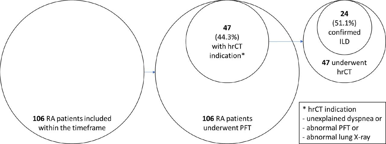 Flow chart of rheumatoid arthritis (RA) patients and their investigations: all 106 patients underwent pulmonary function tests (PFT), 44.3% of them had indication for lung high-resolution computed tomography (hrCT) and 51.1% of the latter were diagnosed hrCT-confirmed interstitial lung disease (ILD).