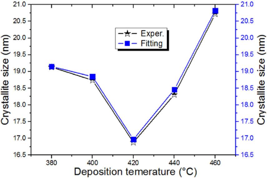Figure 1 shows the variation of the experimental and fitting of the crystallite size at several deposition temperatures in the range of 380–460°C. The measured values of the crystallite sizes were obtained using Eq. (5), which were given in Table 2. This correlation indicated that the crystallite sizes of the NiO thin films can be predominantly influenced by the FWHM β, the lattice parameter a and the differences in a − a0 of the NiO thin films. As seen, all estimated values of crystallite sizes are proportional to the experimental data. Thus, the measurement of the crystallite size values by this proposed model is compatible with practical measurements qualitative. This attribution can be observed with the variation of FWHM β (see Figure 2). This observation was investigated to demonstrate that the calculation of the crystallite size can be influenced by the measurements of the structural parameters (β, a and a − a0).