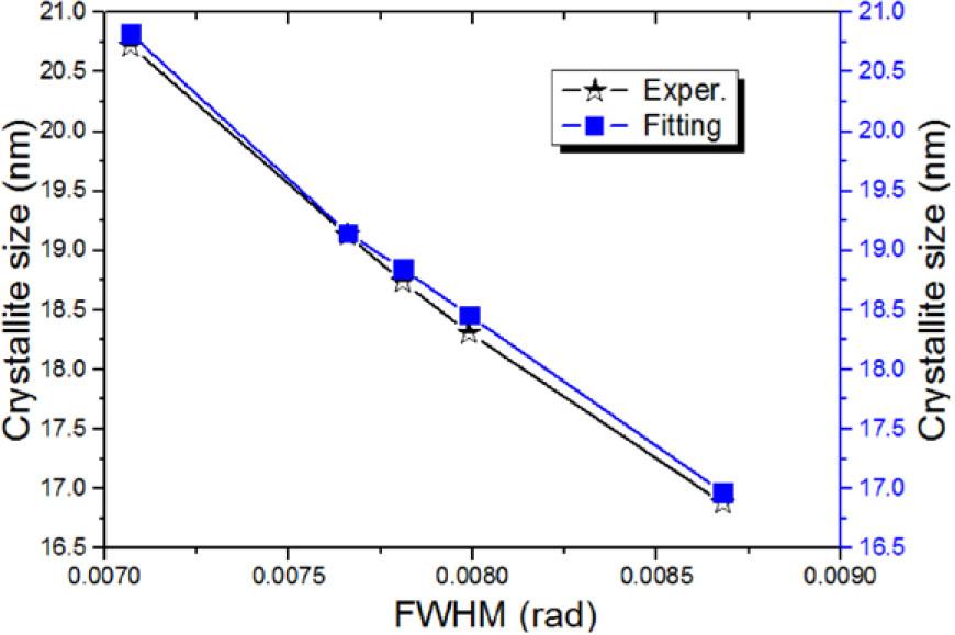 The variation of the crystallite size G experimental and fitting at several FWHM values.