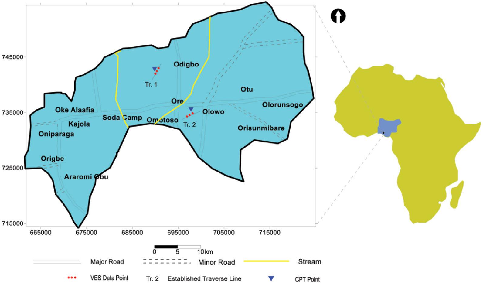 Subsurface investigations employing geophysical techniques are of paramount importance in assessing the suitability of an area for the construction of buildings, roads, bridges, etc. The method has been proven to be an effective tool for identifying anomalies and defining the complexity of the subsurface geology [10, 11, 12, 13, 14, 15, 16, 17, 18, 19, 20, 21, 22, 23, 24, 25, 26, 27, 28]. The electrical imaging or electrical tomography is a survey technique recently developed for the investigation of areas of complex geology. Electrical resistivity imaging was carried out along two established traverses in N - S direction and six VES were conducted in order to delineate the resistivity of the subsurface materials. The technique was used so as to delineate the overburden, weathered zones, fractured columns and where possible, the bedrock at the site. Six (06) Schlumberger vertical electrical soundings (VES) were conducted across the study area using a maximum current electrode separation (AB) of 100 m. Figure 1 shows the VES locations. Resistivity measurements were made with a digital resistivity meter (Ohmega) which allows for readout of current (I) and voltage (V). The field curves were interpreted through partial curve matching with the help of master curves and auxiliary point charts [29–30]. From the preliminary interpretation, initial estimates of the resistivity and thickness of the various geoelectric layers at each VES location were obtained. These geoelectric parameters were later used as starting model for a fast computer-assisted interpretation [31–32]. The program takes the manually derived parameter as a starting geoelectric model, successively improved on it until the error is minimized to an acceptable level. Cone penetration tests were performed at a total of six (6) locations within the study area (Figure 1). The tests were carried out to a depth of 3 m. The Dutch static penetration measures the resistance of penetration into soils using a 60 ° steel cone with an area of 10.2 cm2.